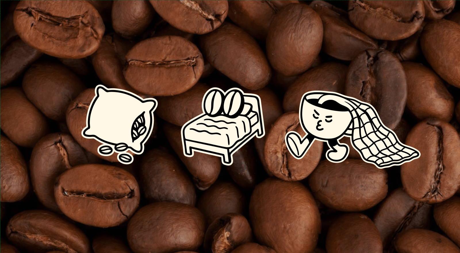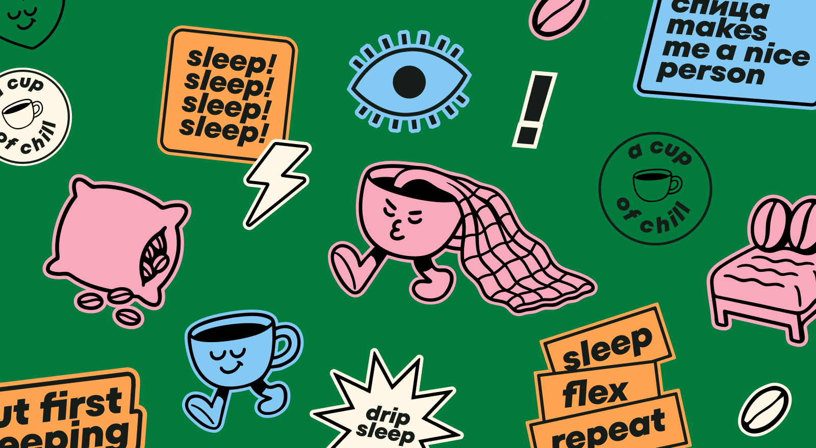 Стикеры мы делим на несколько групп: есть забавные визуальные, которые объединяют кофейные образы с товарами для сна — тут и кружка с вытекающим из неё одеялом, и кровать с кофейными зернышками вместо подушек или подушка, наполненная кофе.