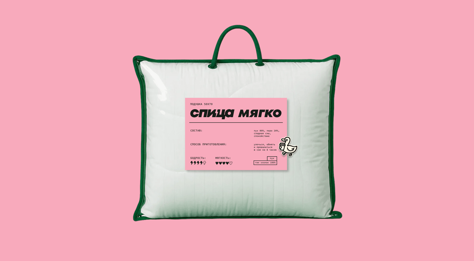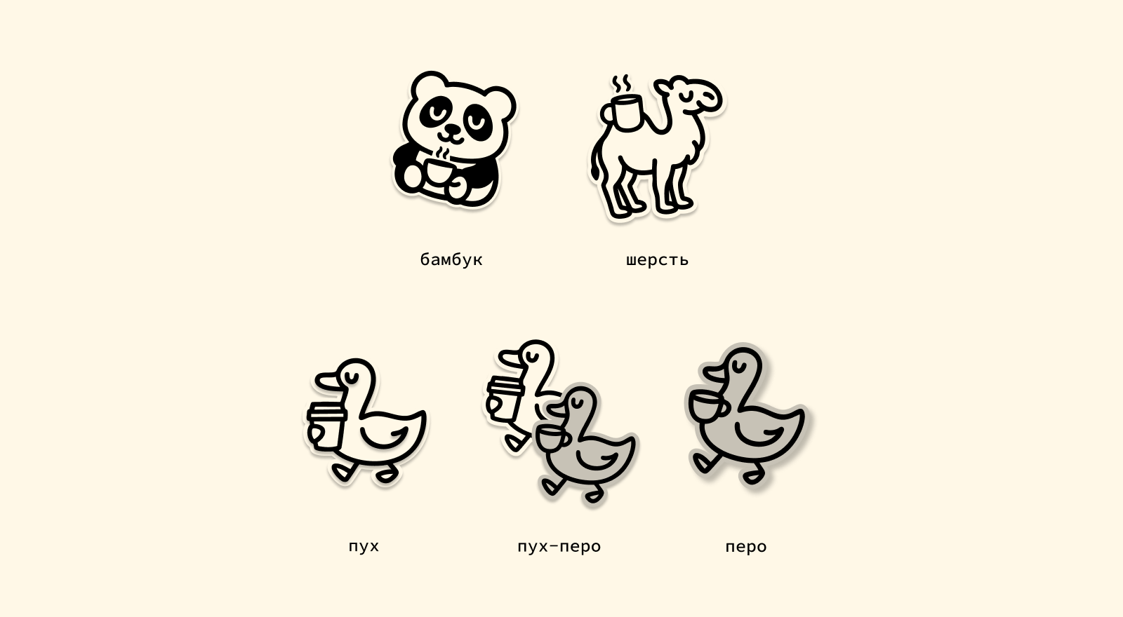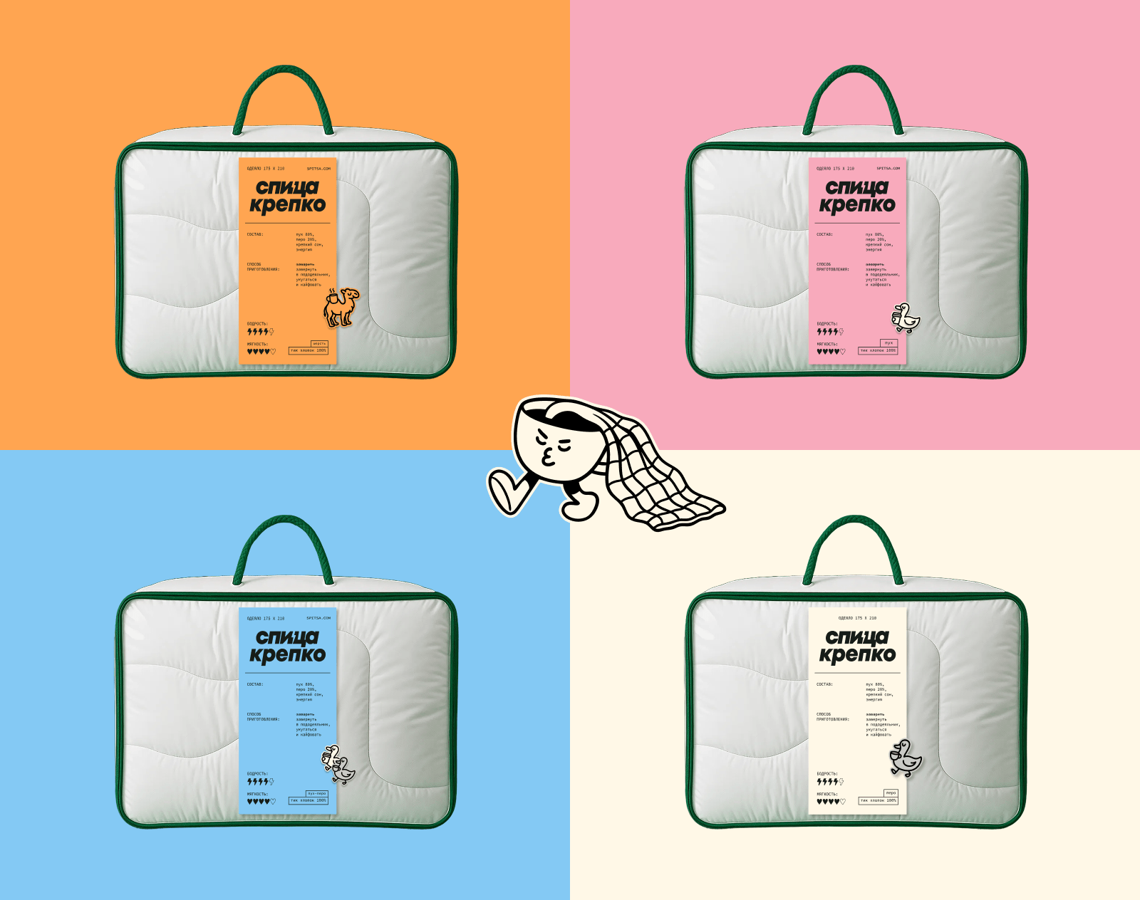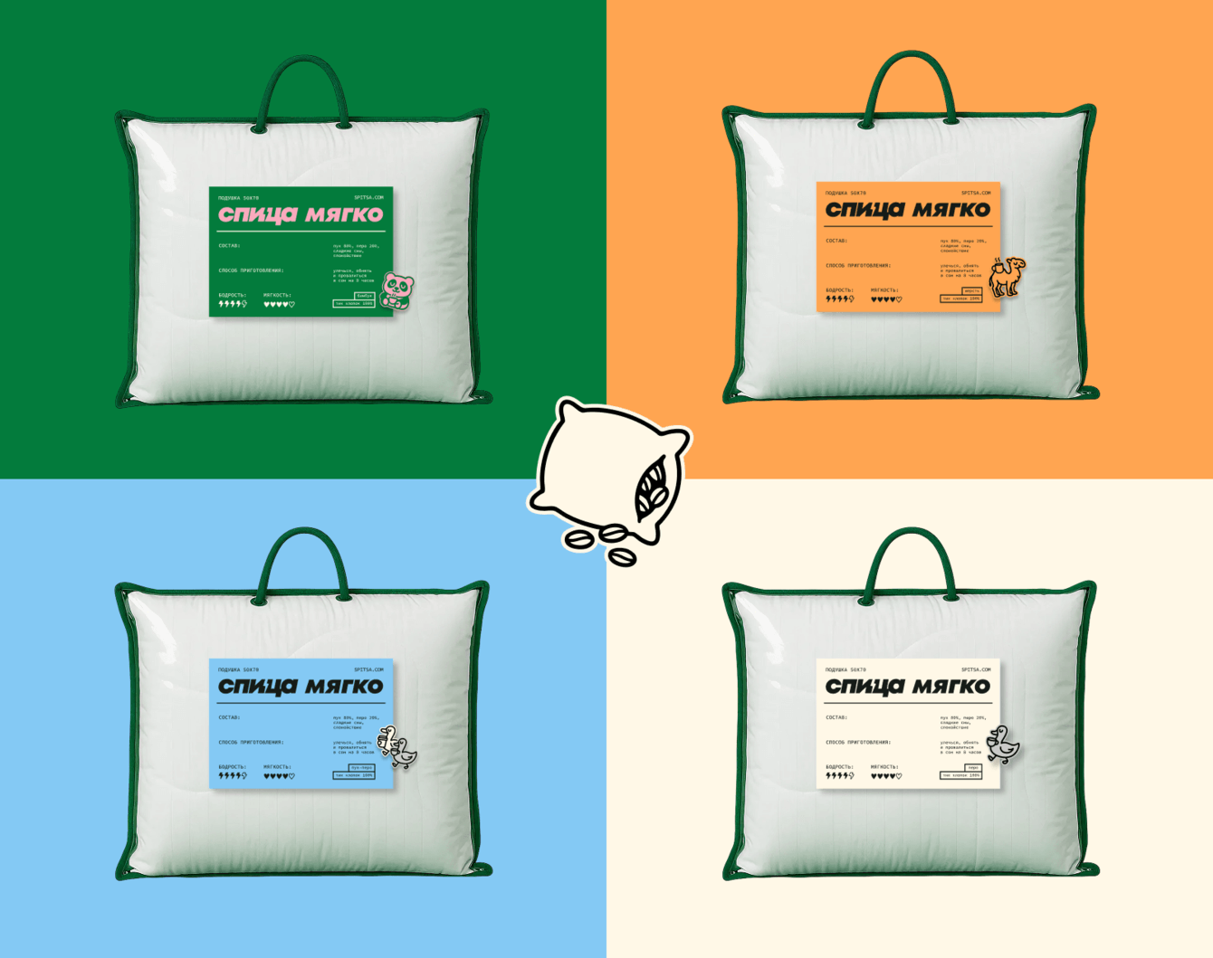 Отдельно мы разработали серию стикеров для разделения товаров для сна по наполнителю и даже умудрились сделать отсылку к народной песне про двух веселых гусей (один серый, другой белый, оба любят спицу).