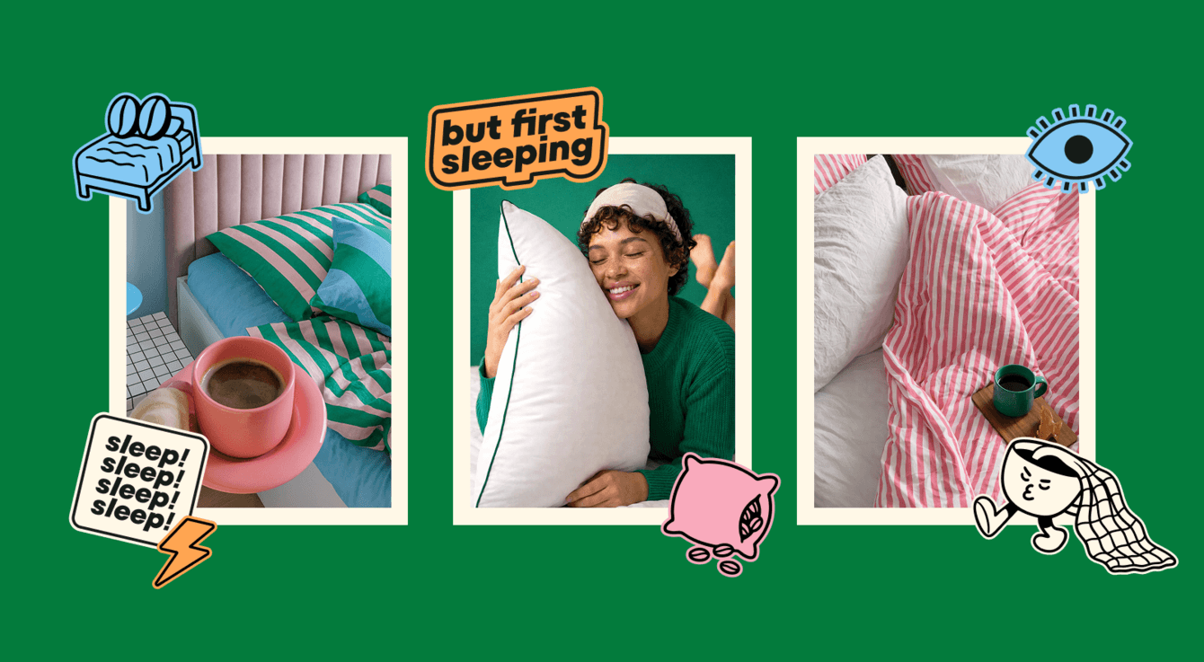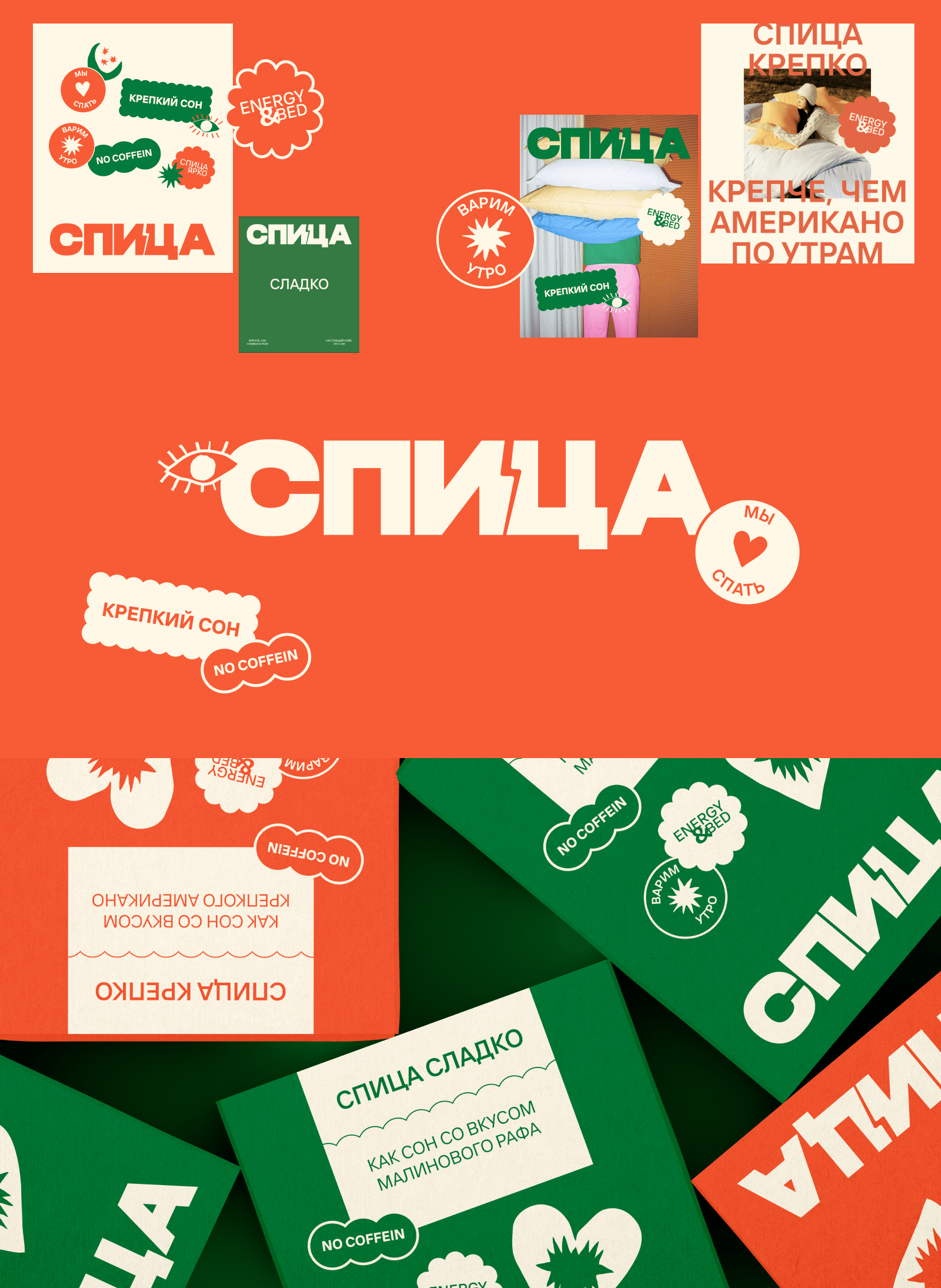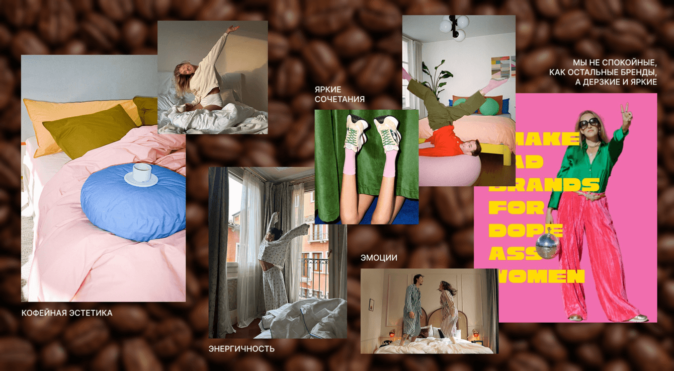 В третьей концепции мы решили взглянуть на мир подушек и одеял под новым углом — а что, если наши конкуренты, это не другие подушечно-одеяльные бренды, а товары для бодрости? Кофе там, энергетики и прочие вещи, которые помогают тебе проснуться, когда ты почему-то плохо поспал?