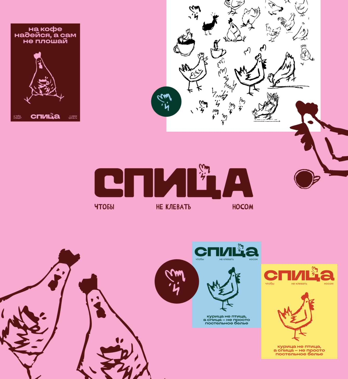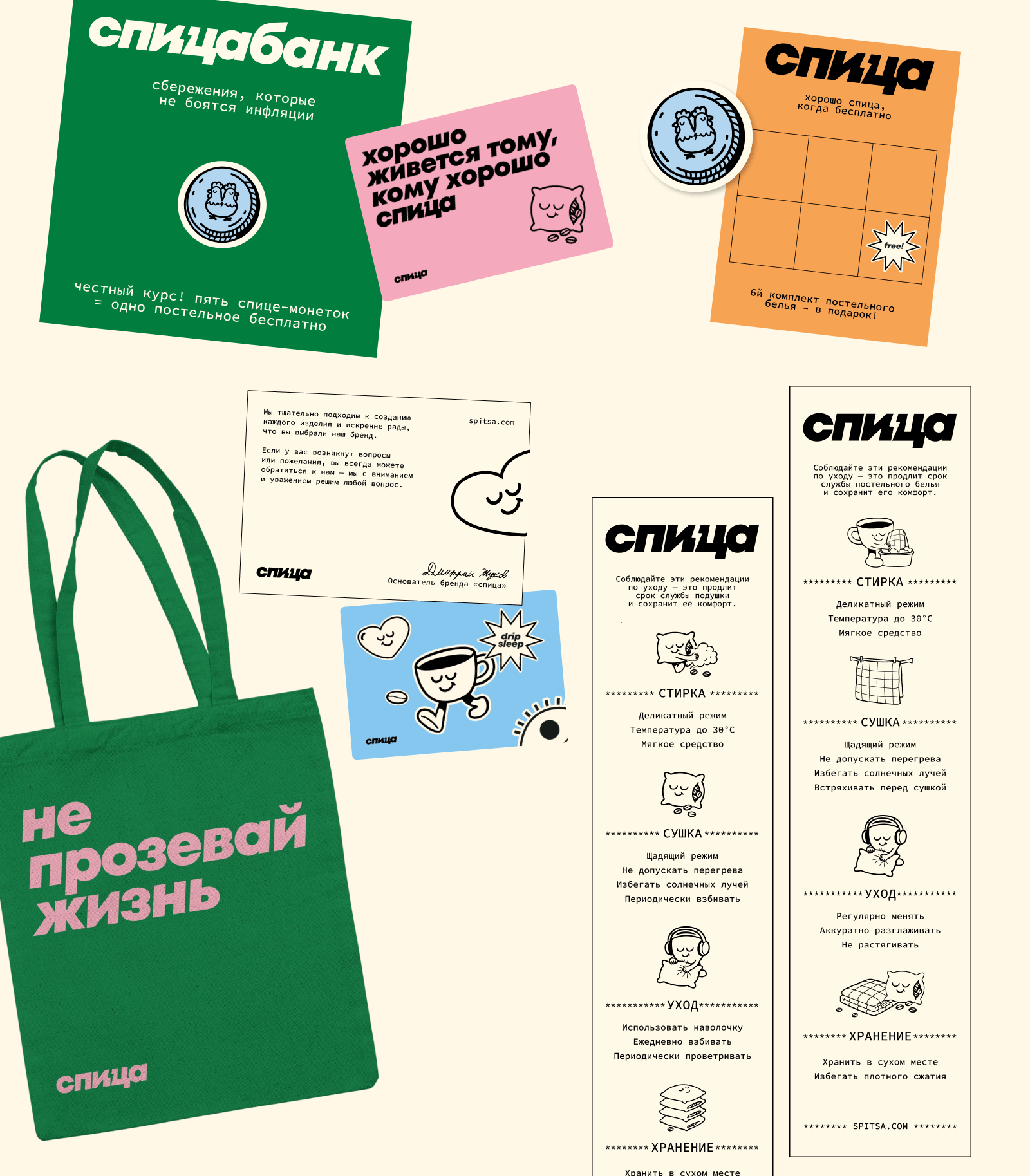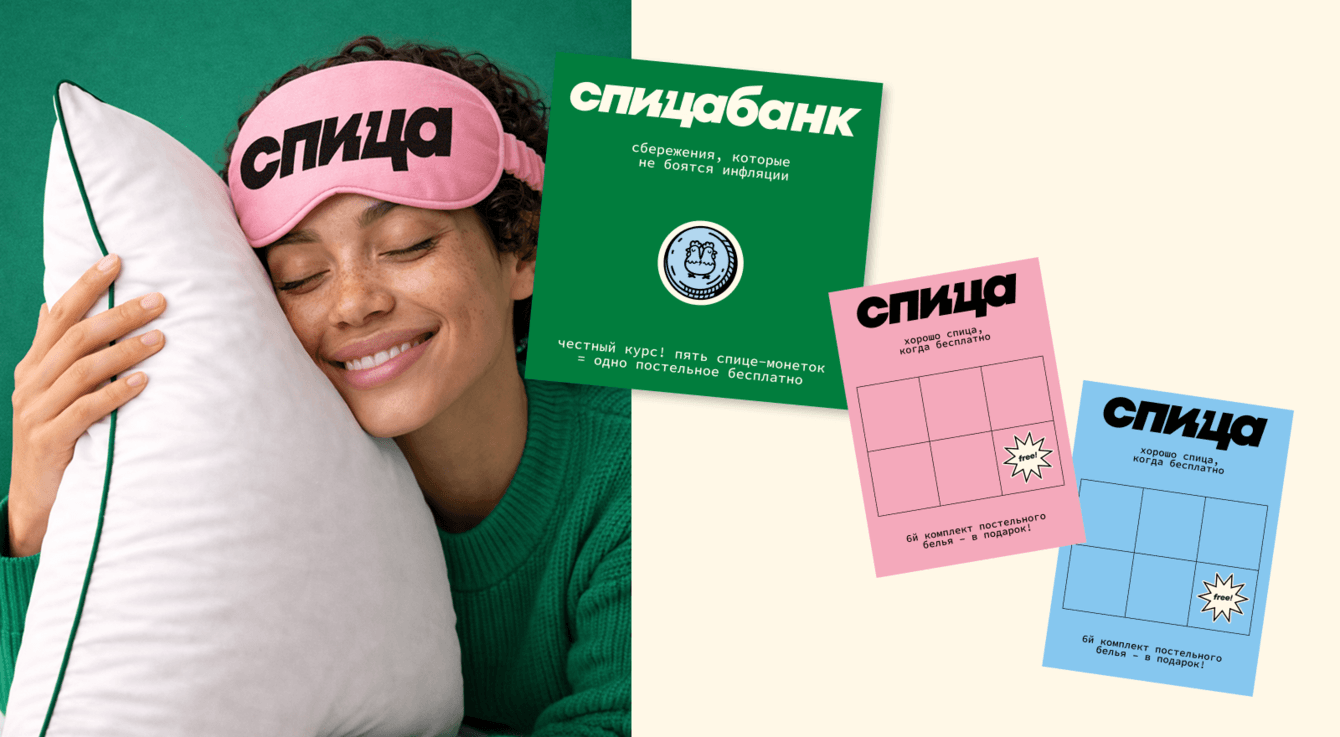 В карточке лояльности нам удалось сохранить курицу! Вы еще помните о ней? Нам хотелось сделать карточки похожими на кофейные — когда ты собираешь стикеры, чтобы получить бесплатный кофе. У нас тоже можно собирать стикеры — и шестое постельное будет в подарок. Для карты лояльности нам хотелось создать уникальный стикер, и мы придумали спицебанк со спицемонетками — вместо двухглавого орла здесь двухглавая курица, которая не боится инфляции.