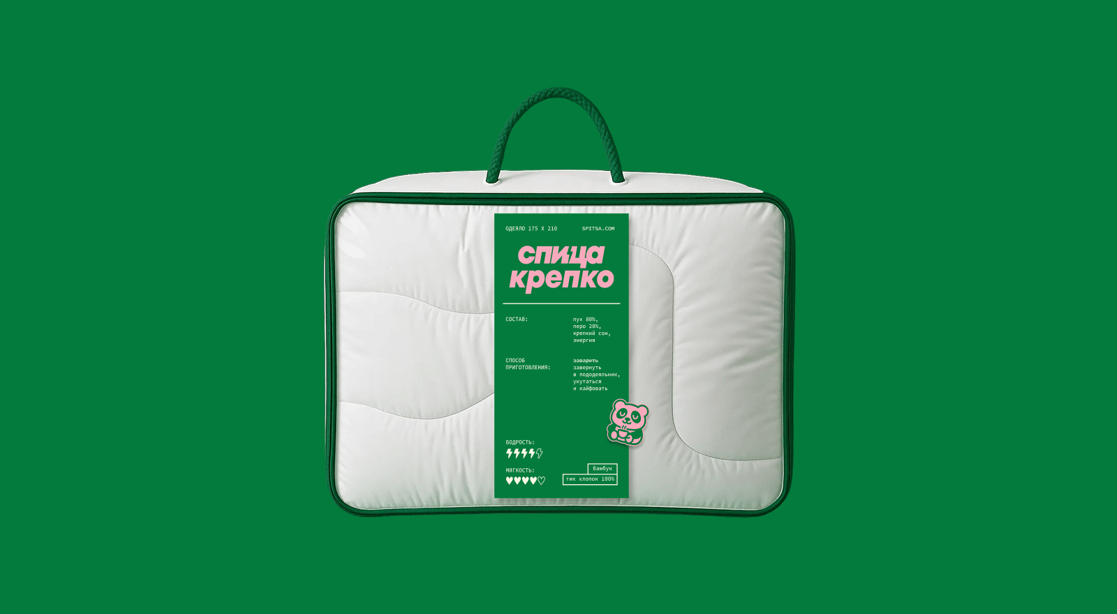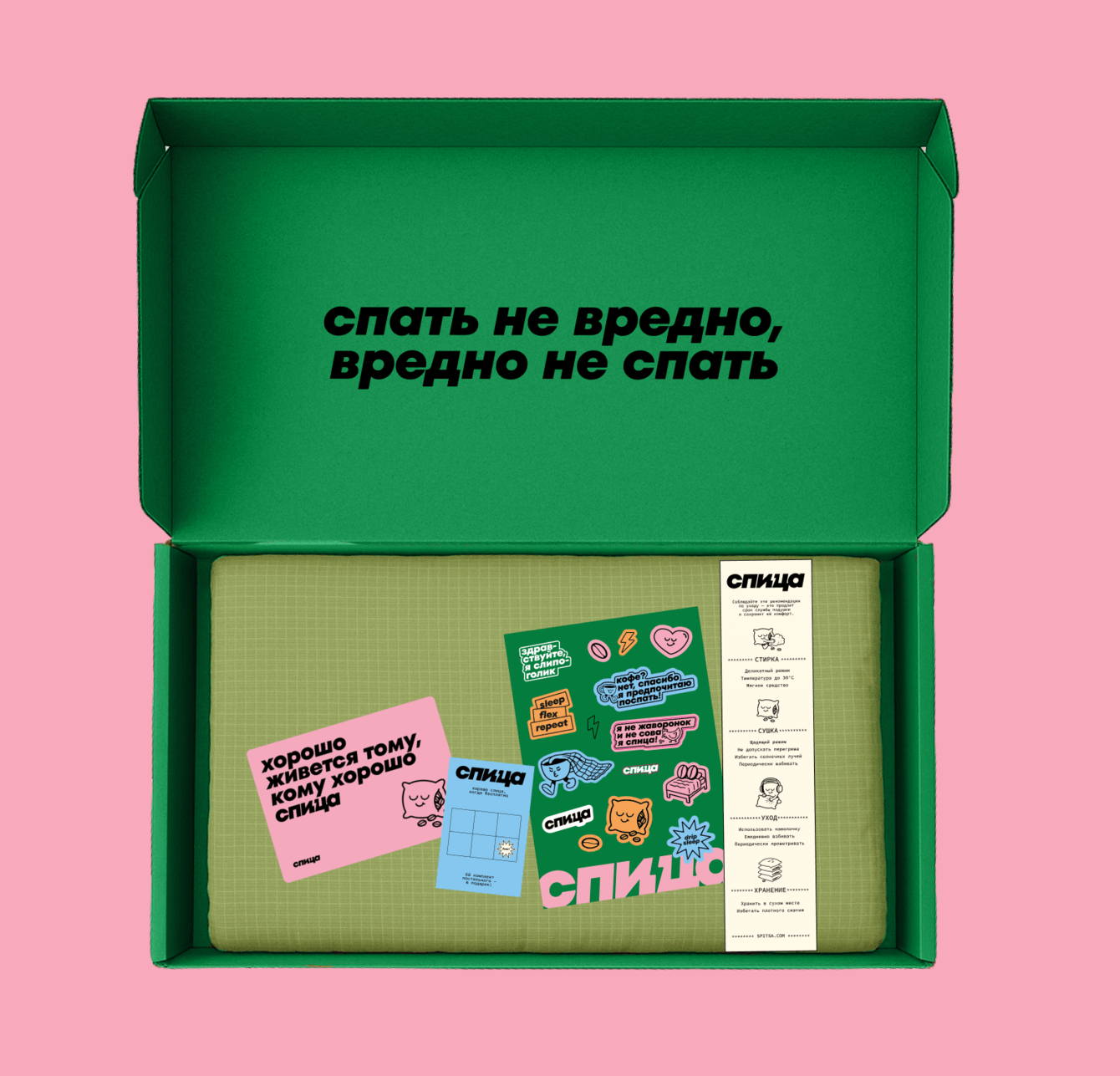 Мы создали универсальную основу: зеленую коробку с откидной крышкой, которая идеально подходит под все комплекты постельного, а для подушек и одеял подобрали стандартные универсальные чехлы. Брендированными всё это становится благодаря стикерам — их клеят вручную, играя с размещением: строго по центру, асимметрично сбоку, ровно или чуть криво. В итоге каждая коробка у покупателя выходит своей, кастомной. А по цвету стикера легко можно легко узнать, какой наполнитель внутри подушки или одеяла, не вчитываясь в текст.