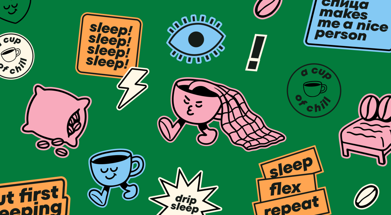 Сами стикеры стилизованы под кофейные этикетки: линии, минималистичность и даже инфографика, обозначающая крепость сна и ожидаемую бодрость.