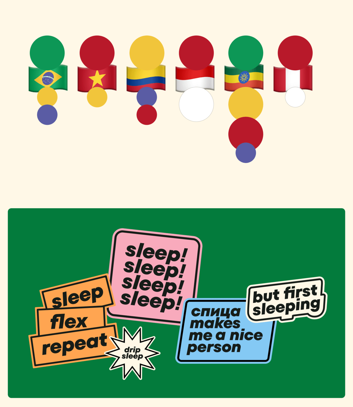 Так мы решили вдохновиться странами-лидерами по производству кофе. Нашли рейтинг и собрали вместе флаги из топа — это Бразилия, Вьетнам, Колумбия, Индонезия, Эфиопия и Перу. Цвета всех этих стран раскладывались на четыре базовых цвета — зеленый (основной, потому что Бразилия совсем уж безусловный лидер), красный, желтый и синий: