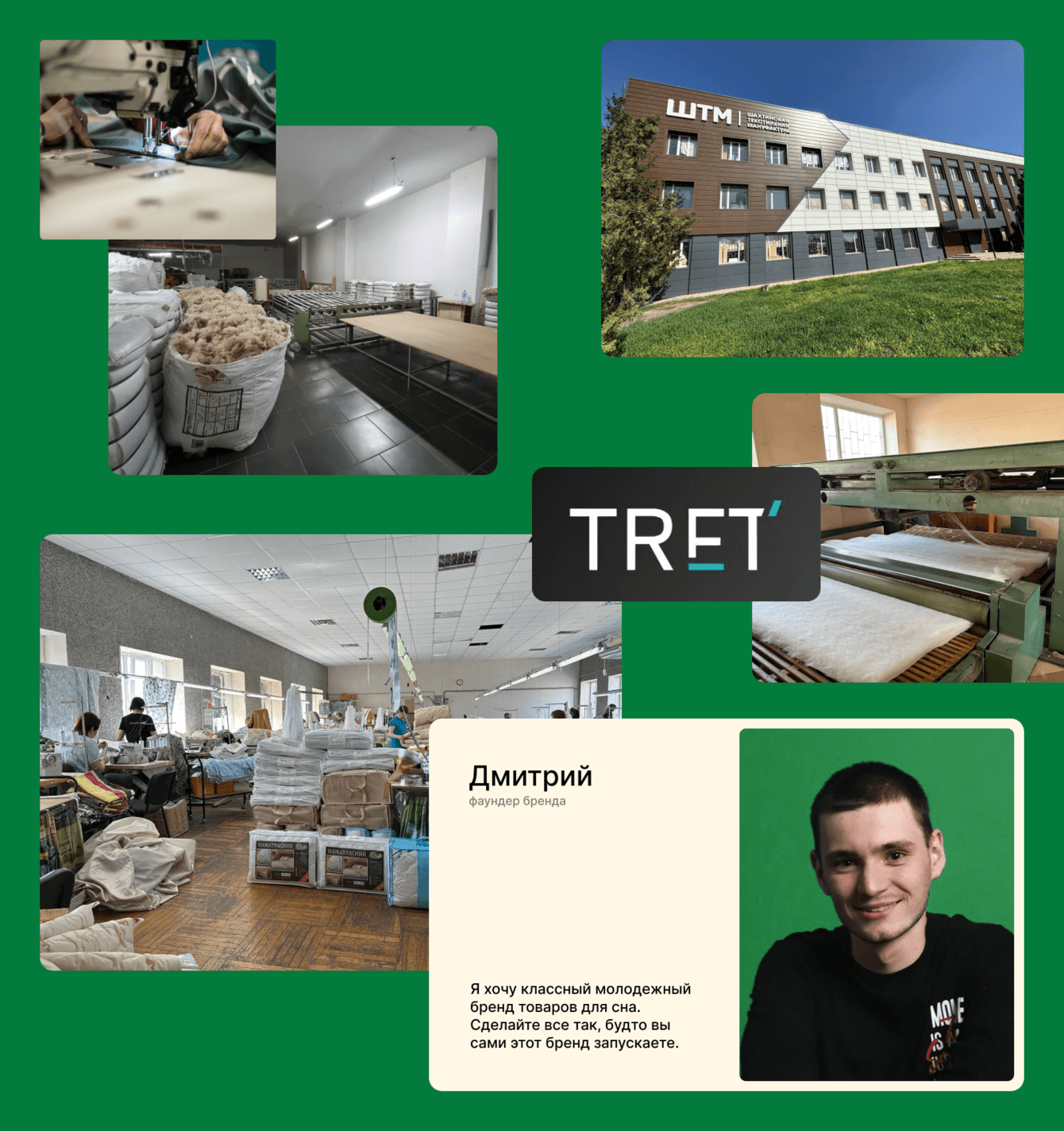 Откуда у молодого предпринимателя фабрика подушек? Его родители запустили это производство ещё 30 лет назад и успешно продавали продукцию оптом — под другими брендами, в магазины, отели и базы отдыха. За это время много перьев разлетелось, рынок сместился на «эти ваши маркетплейсы» и появилась потребность в создании нового, сильного и независимого от фабрики бренда.