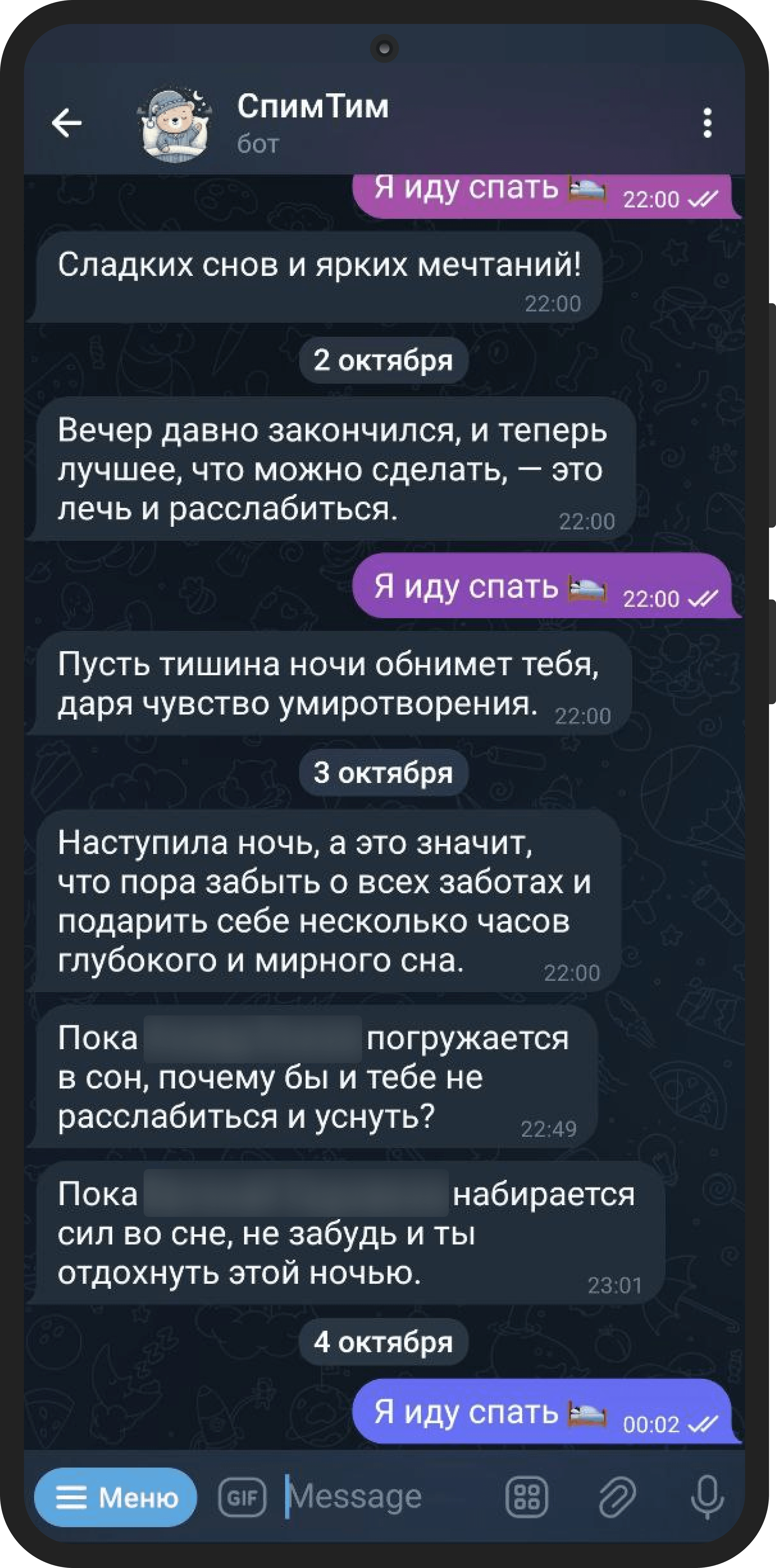 Бот растёт органически — по рекомендациям, через личные переписки, просто как «приятная штука, которая помогает вовремя лечь спать».