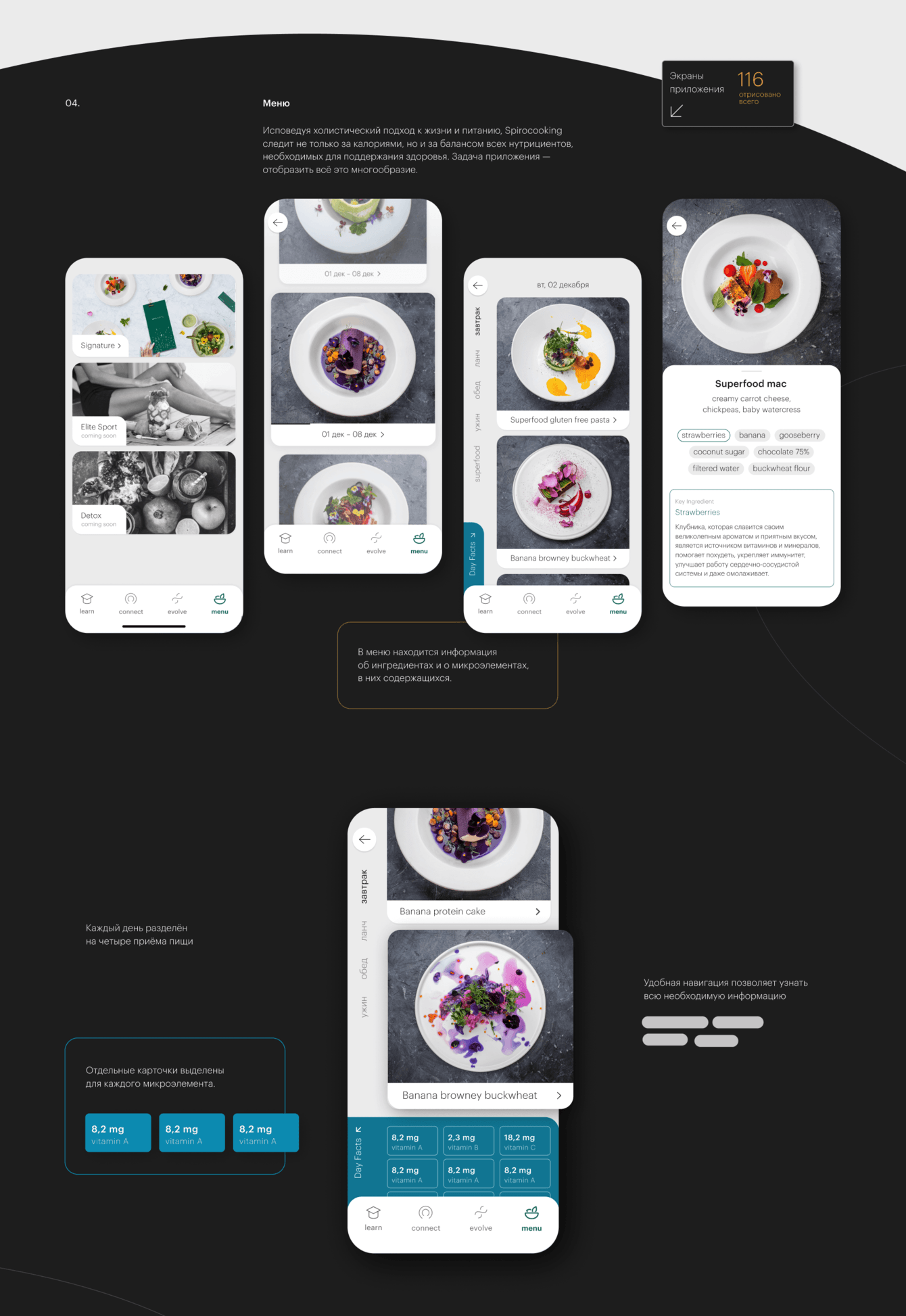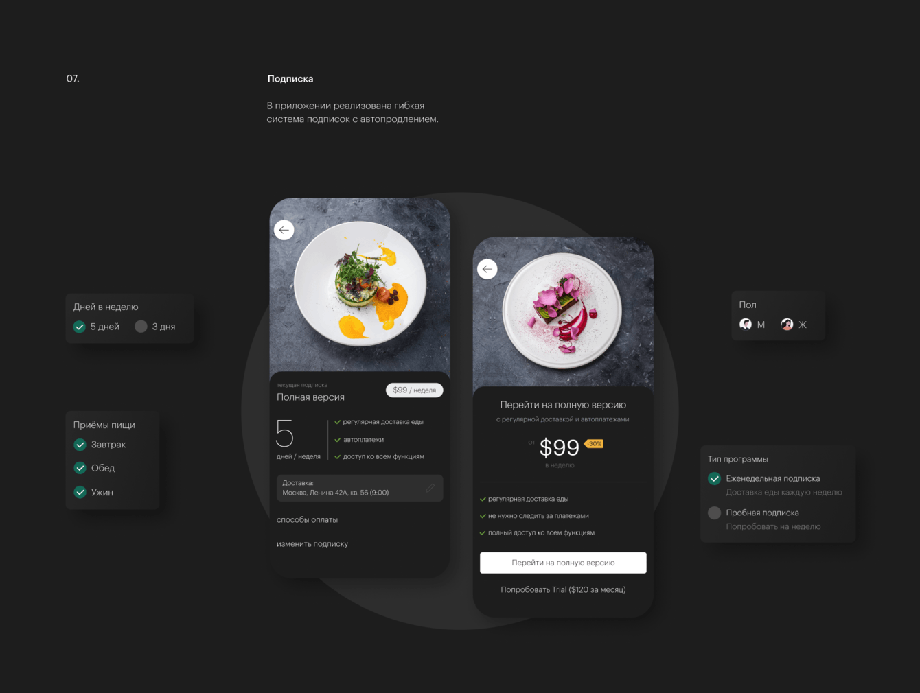 Целью было создание приложения со следующими функциями: заказ и изменение подписки с едой, соцсети с картой и экспертами, мини-блог с полезными статьями.