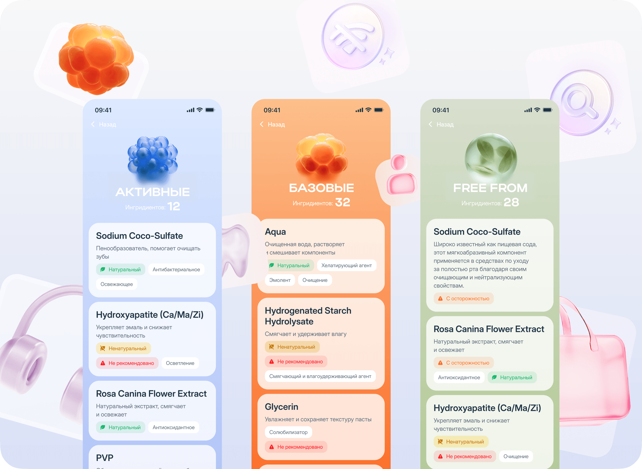 Взрослый визуал разрабатывался на основе гайдбука компании и сохранял фирменные цвета, шрифты и общую эстетику бренда. Дизайн сочетает журнальную эстетику, холодные градиенты и стеклянные элементы интерфейса, подчёркивая экспертность, технологичность и профессионализм, создавая доверие и комфорт при взаимодействии с образовательным контентом и сервисами ухода за зубами.