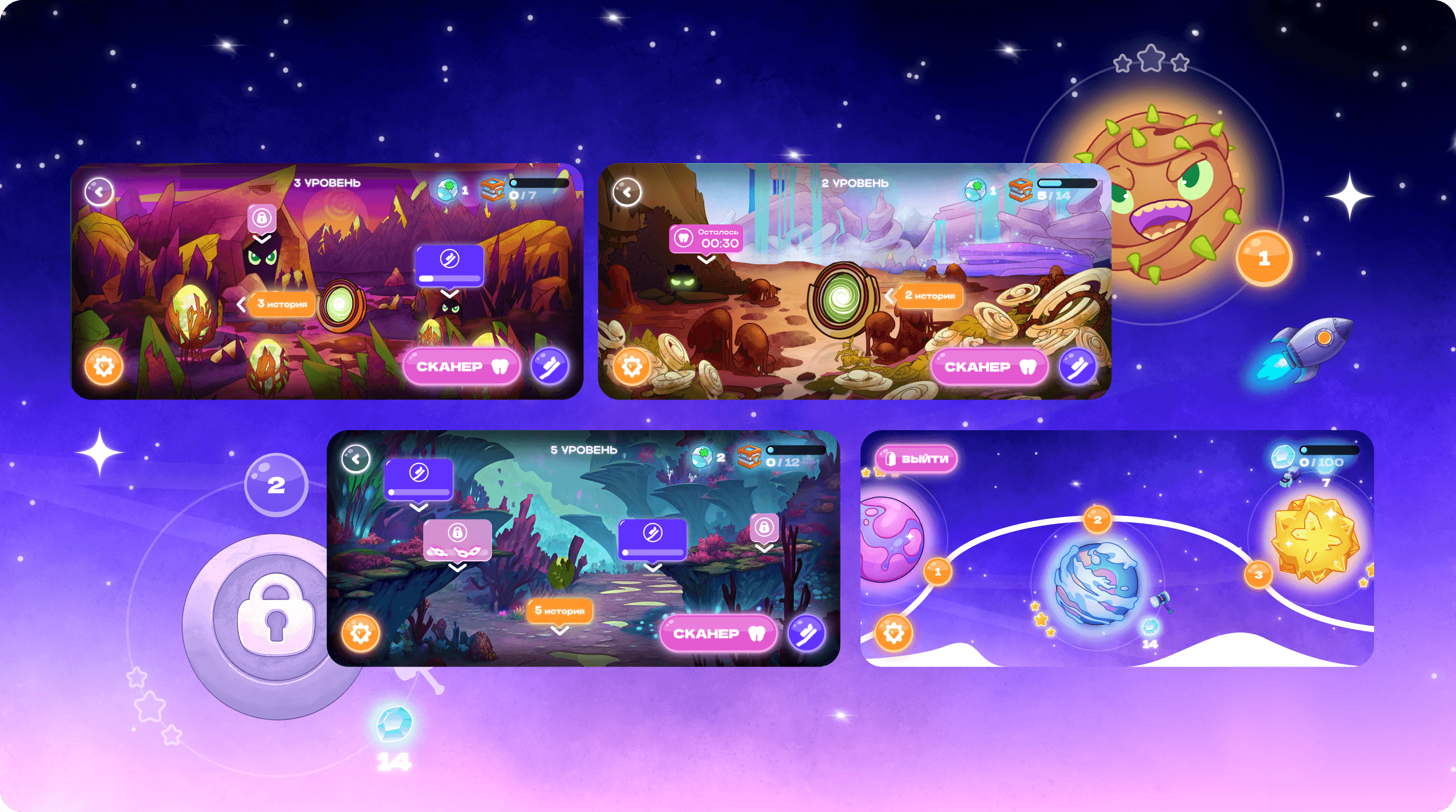Детский сценарий (7–11 лет) построен на геймификации: интерактивная история, персонажи, задания и награды, которые превращают уход за зубами в игру.
