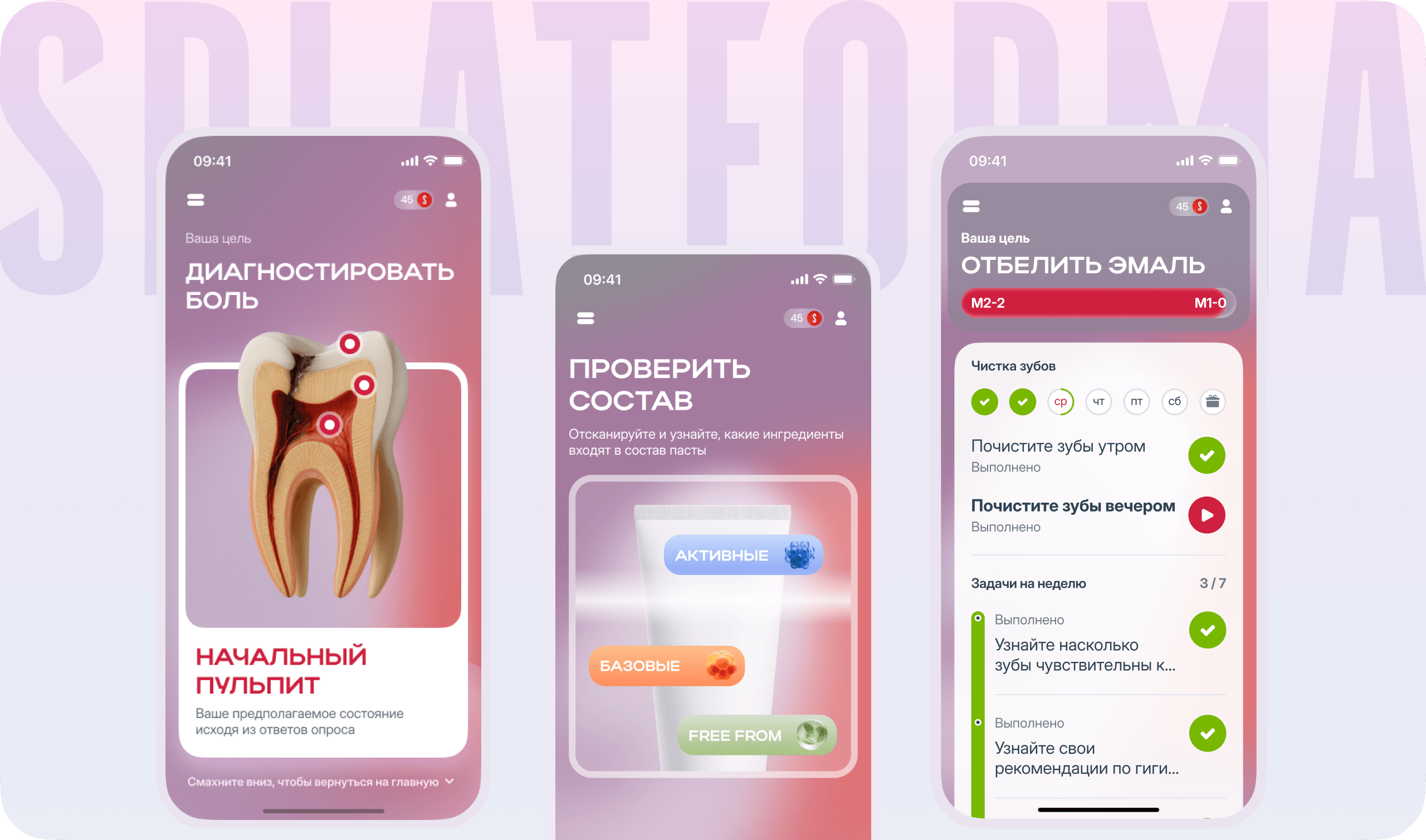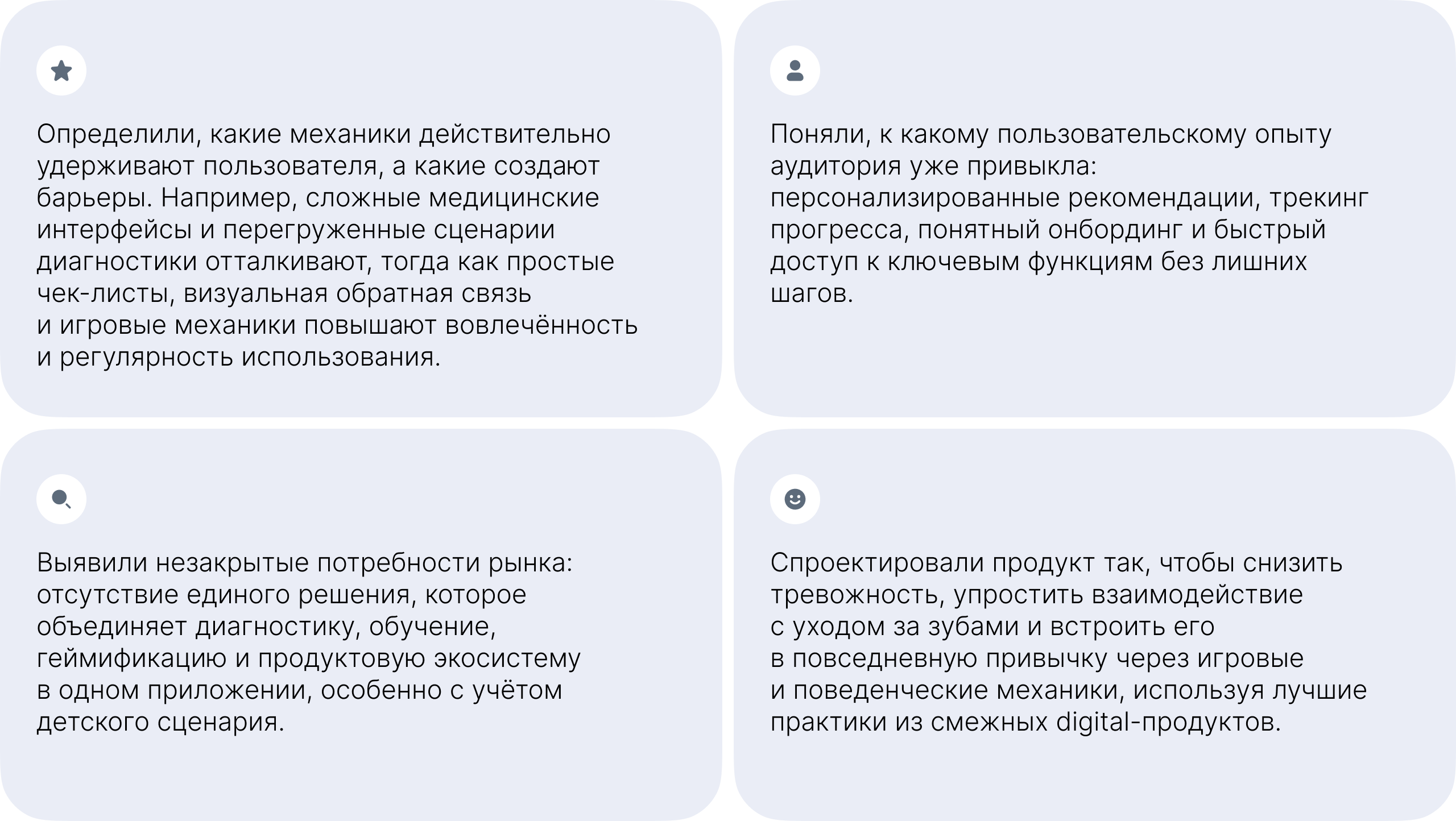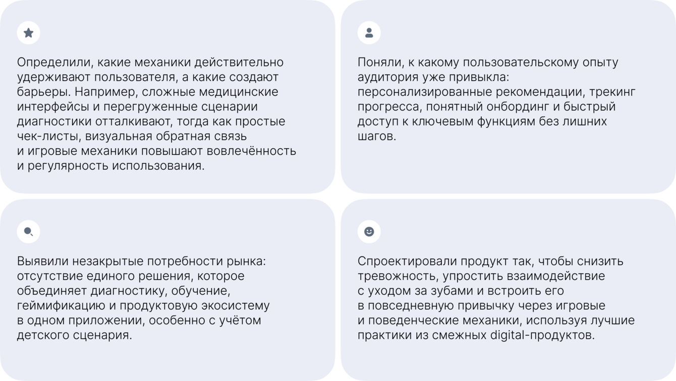 Мы провели анализ цифровых решений в категориях health-tech на европейских и азиатских рынках среди стоматологических сервисов и геймифицированных приложений перед проектированием Splat: