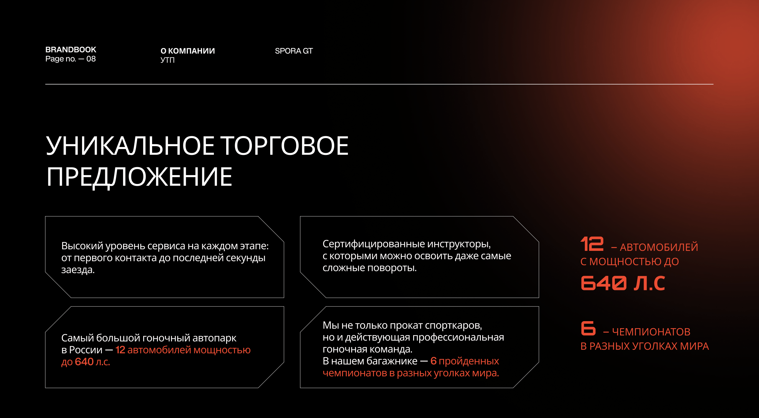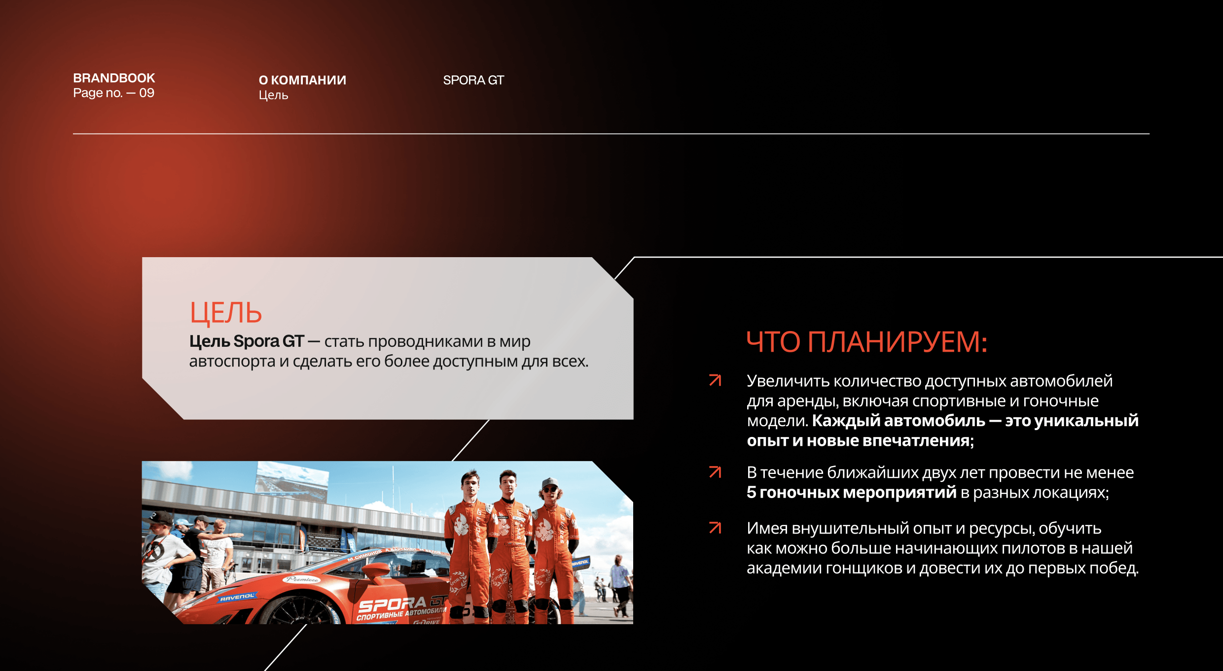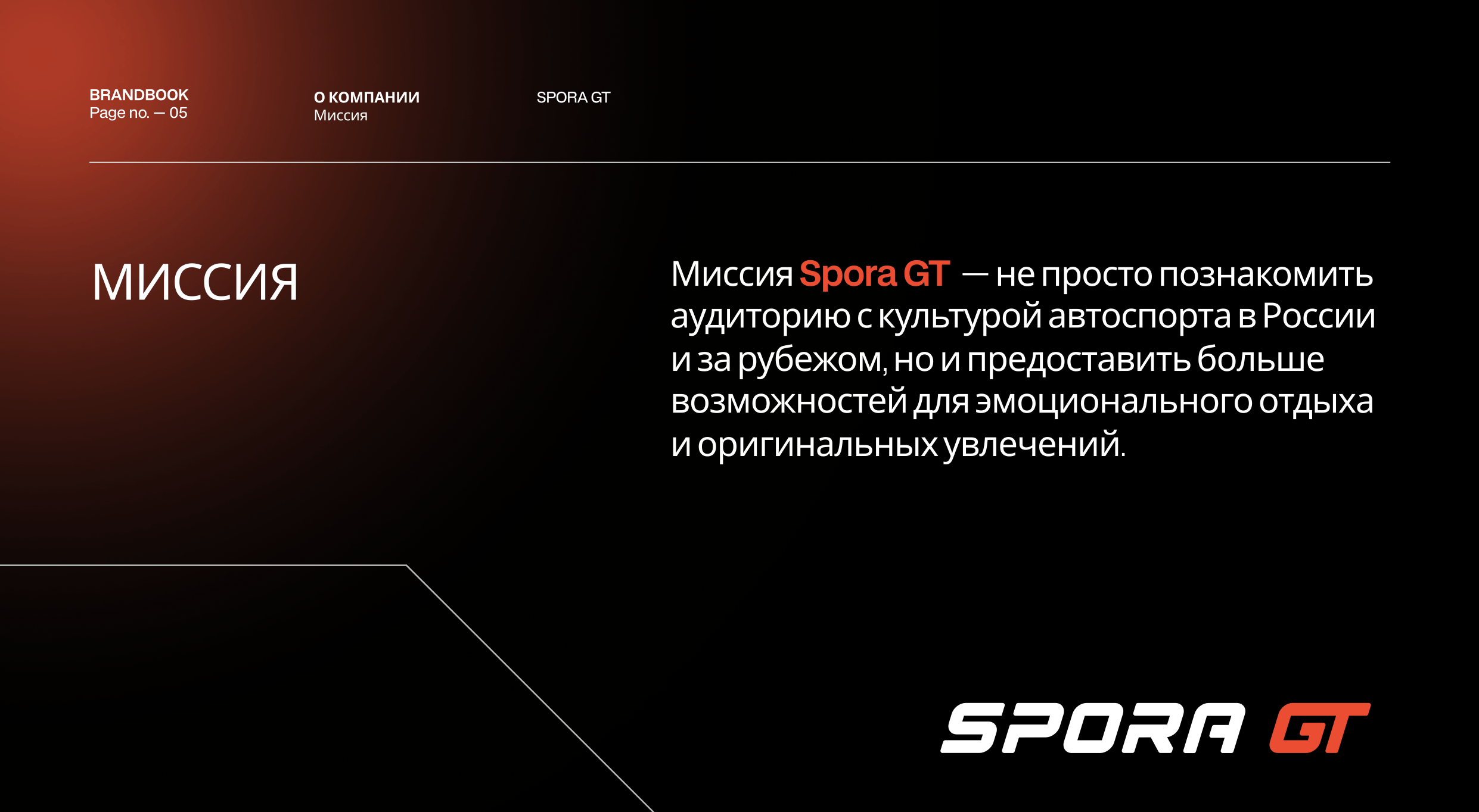 SPORA GT — амбициозная компания, которая развивается в спортивном автомобильном сегменте и делает ставку на системный подход к развитию бренда. Клиент пришел к нам с желанием структурировать и обновить фирменный стиль, сделать коммуникацию единой, а бренд — более сильным и узнаваемым.