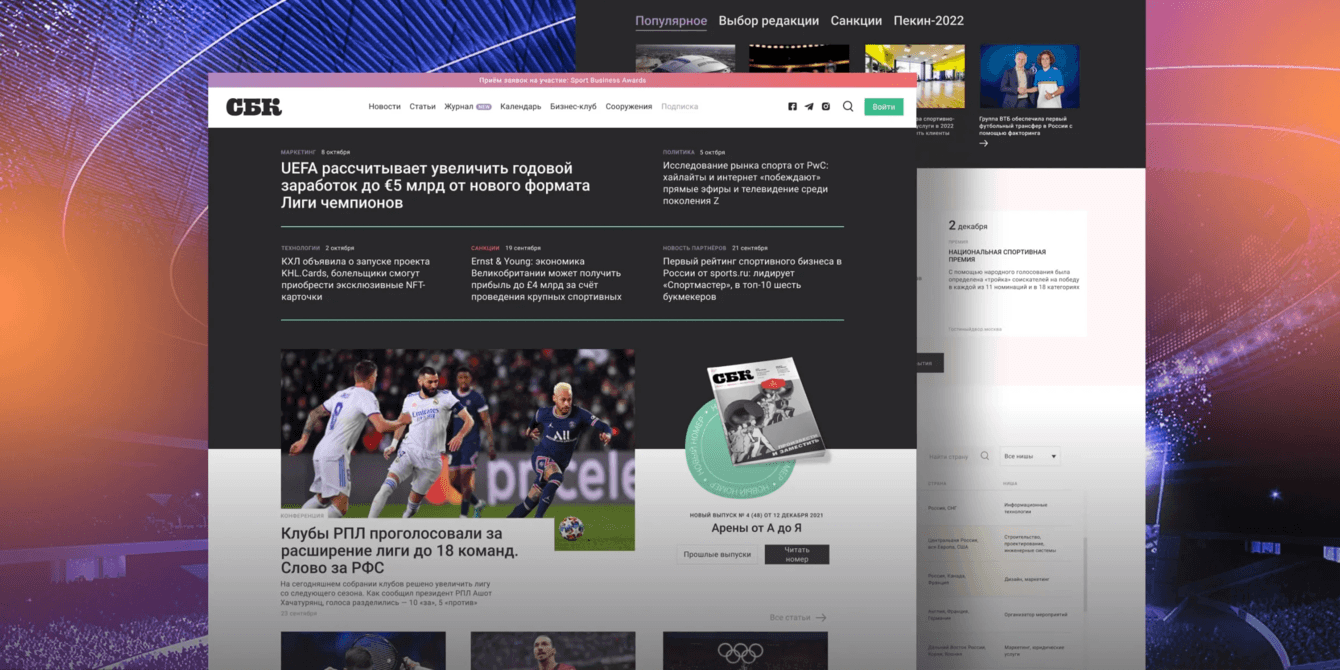 Мы совместно с редакцией СБК разработали прототип нового дизайна сайта, стилеобразующие элементы и фирменные детали. Переработали рубрикатор и систематизировали контент, добавили тегирование и полезную сортировку наиболее посещаемых разделов. Мы оптимизировали типографику и решения цветовой палитры, улучшили пользовательский опыт (UX) личного кабинета. Новый сайт СБК получил удобный блок Бизнес-клуба для пользователей, понятный каталог сооружений, наглядный календарь спортивных событий и полноценную мобильную версию.