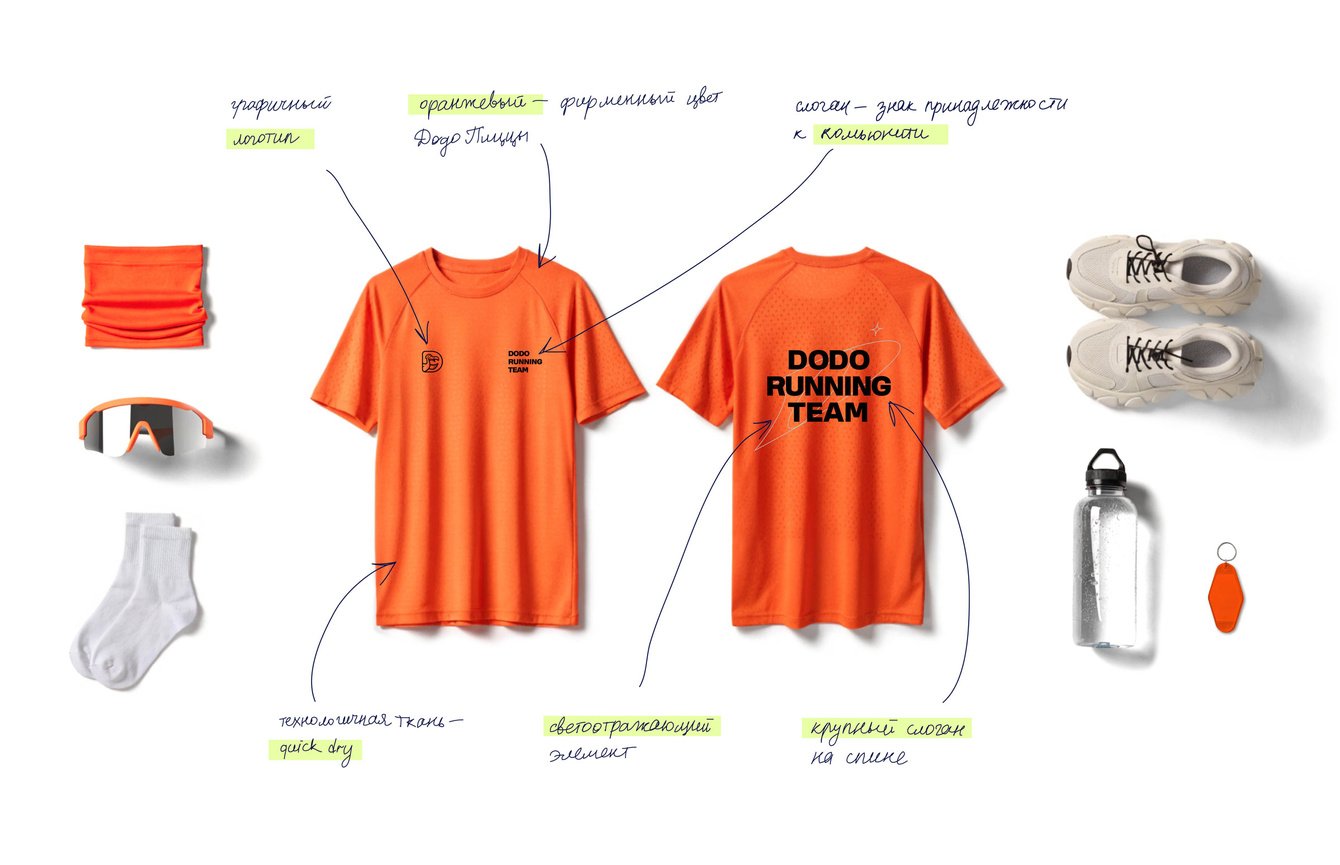По форме должно считываться, что это Додо, а стиль узнаваться в толпе и на фотографиях. Обязательно без персонализации, единая для всех участников, на груди будет закрепляться стартовый номер. Во всем этом нужно аккуратно отразить характер бренда, но не превращать форму в рекламный носитель.