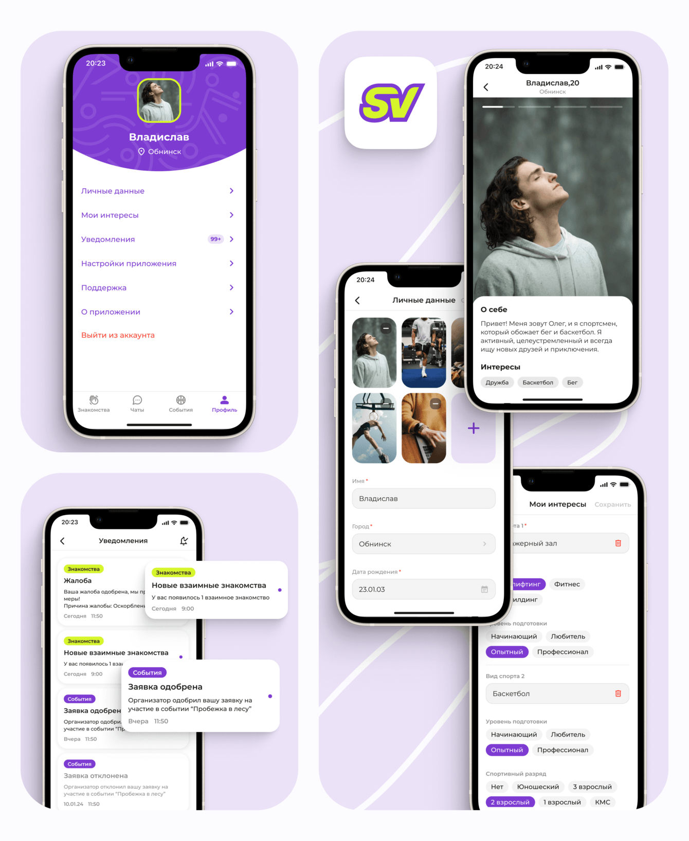 Пользователь в профиле может просто отредактировать свои данные, включая спортивные интересы, а с помощью уведомлений он получает полную информацию о событиях и новых знакомствах.