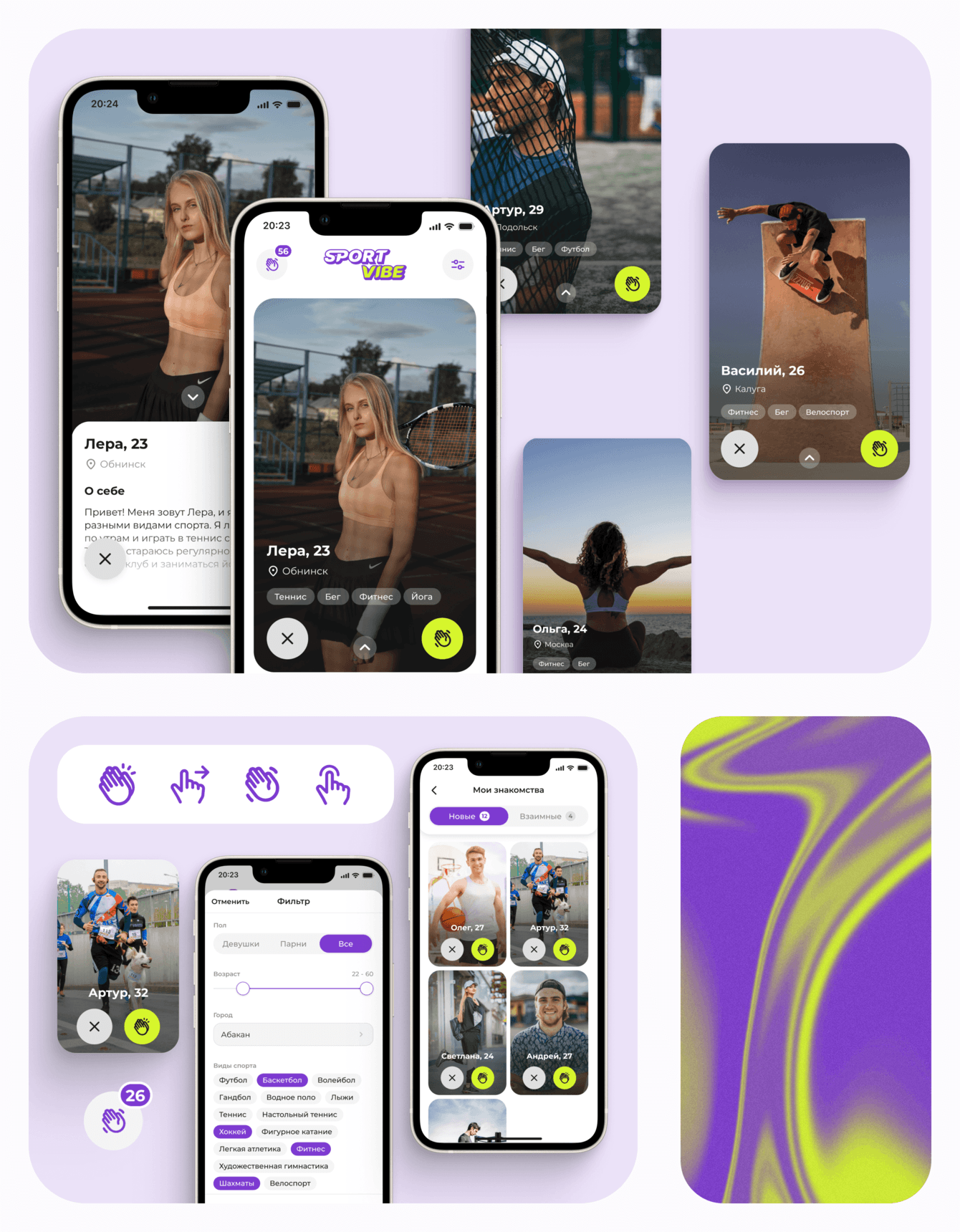 Основной функционал — это просмотр анкет других пользователей с фильтрацией по городу, полу и возрасту, а также спортивным интересам.
