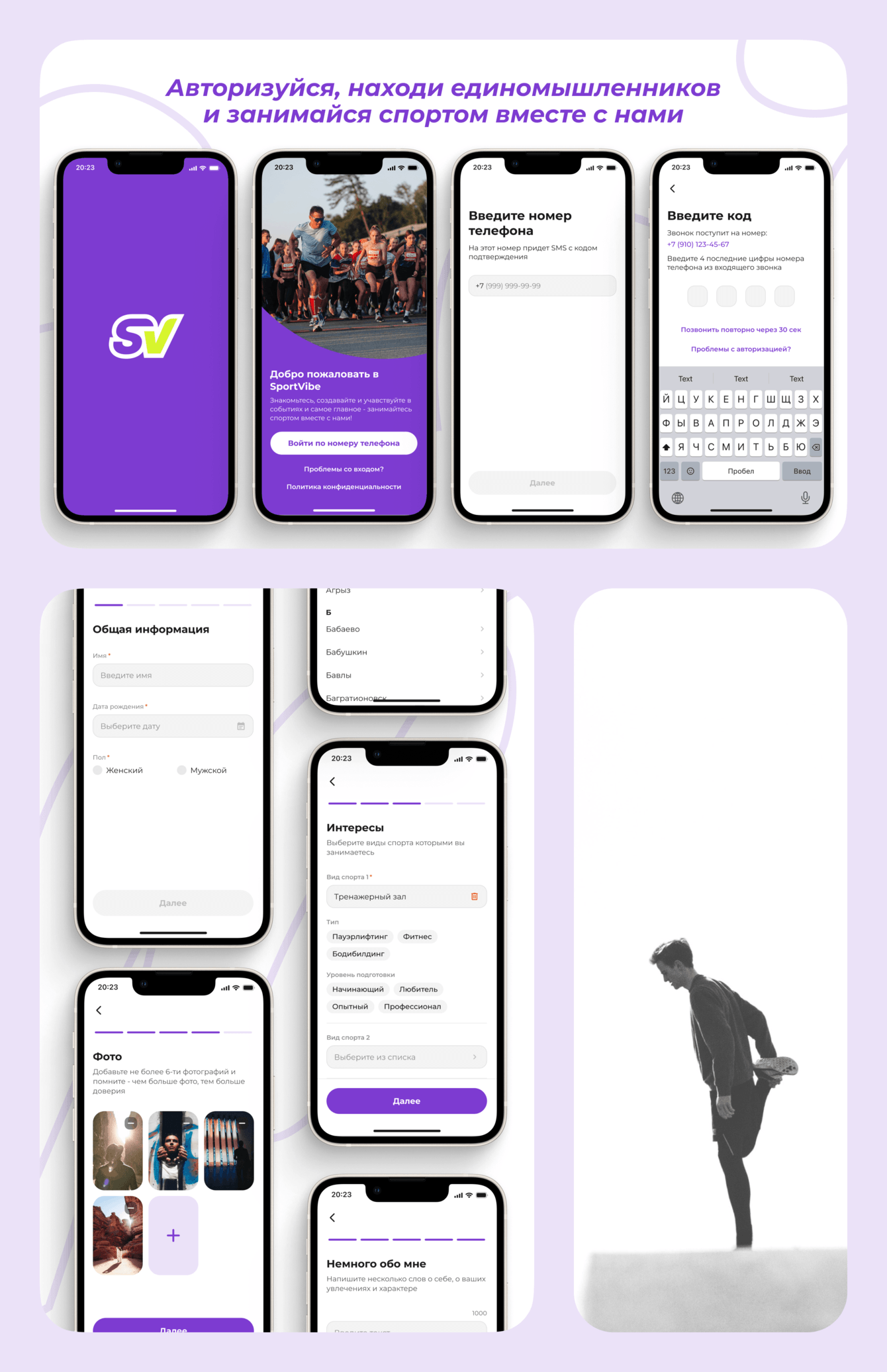 Чтобы пользователь мог воспользоваться полным функционалом приложения, ему необходимо заполнить коротко информацию о себе, в каком городе он живет, добавить фотографии, и указать какие спортивные интересы у него есть. Вся эта информация понадобится для создания будущих ивентов и новых знакомств.