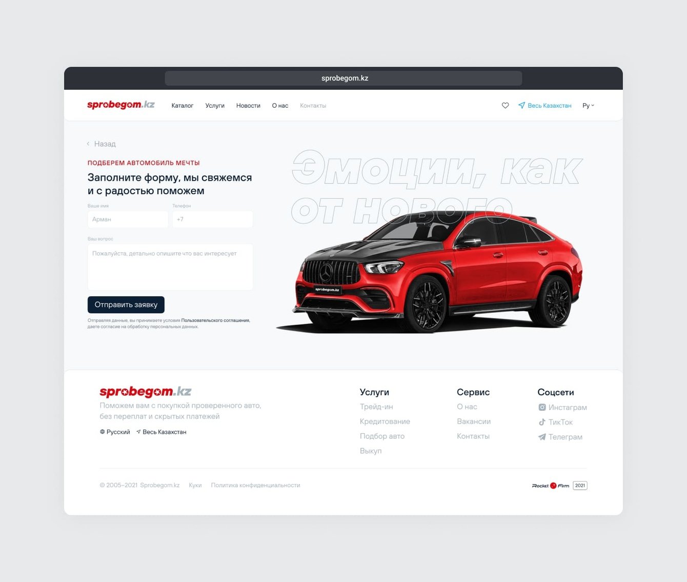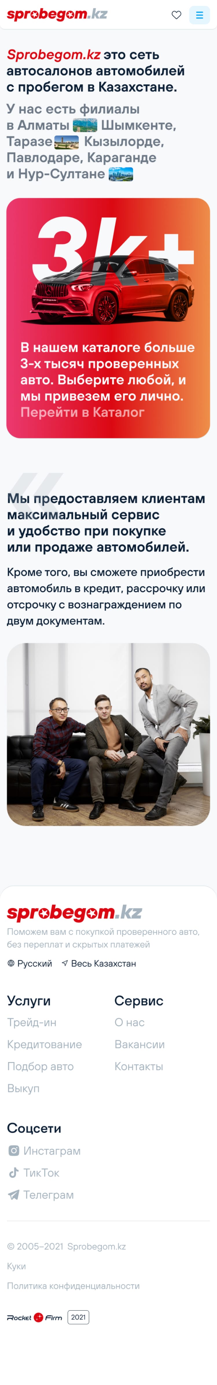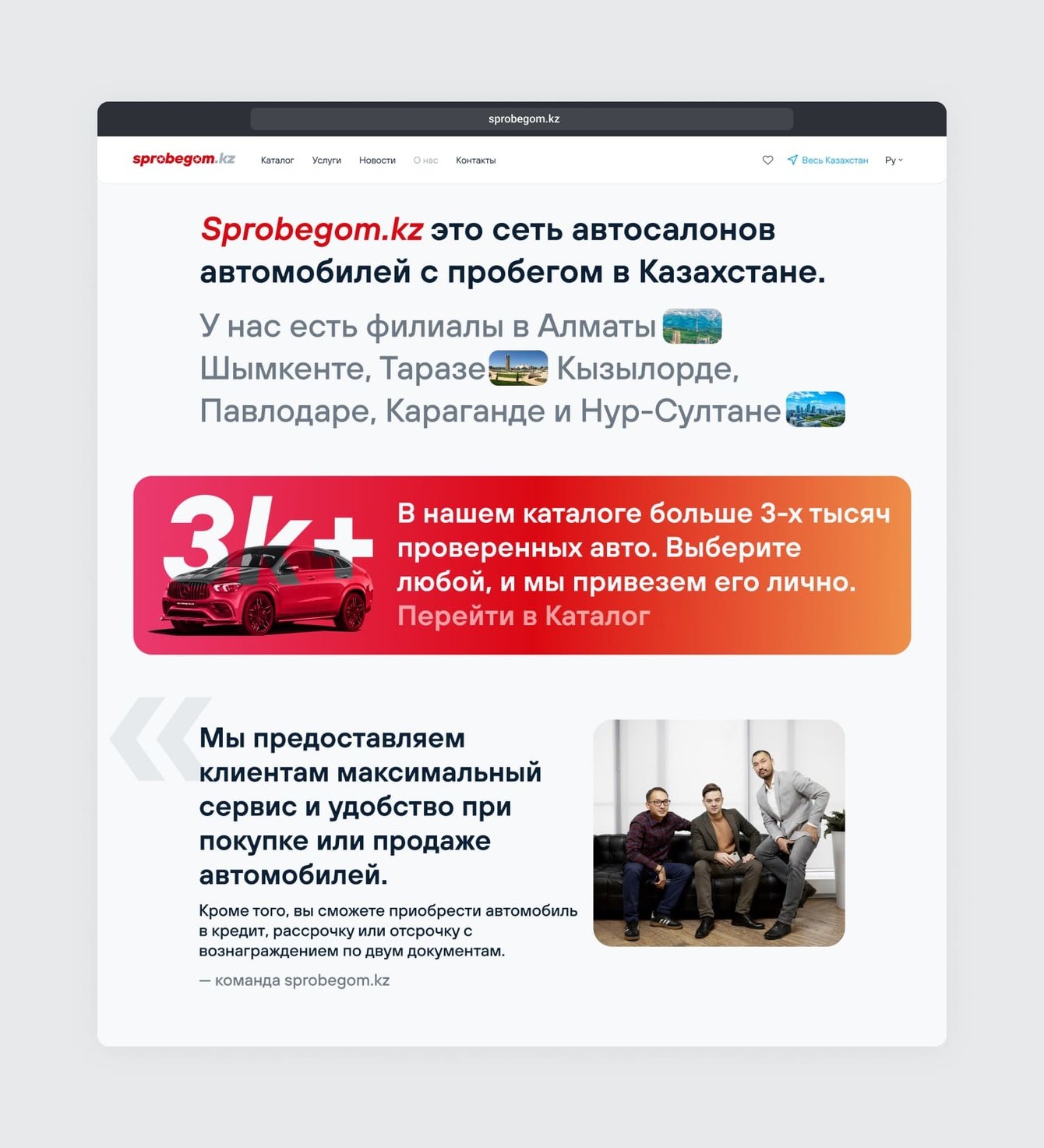 Sprobegom.kz — сервис продажи проверенных подержанных автомобилей из салона. В «Ракетной фирме» спроектировали основные пути пользователя, создали прототипы, оформили дизайн и полностью запрограммировали сервис.