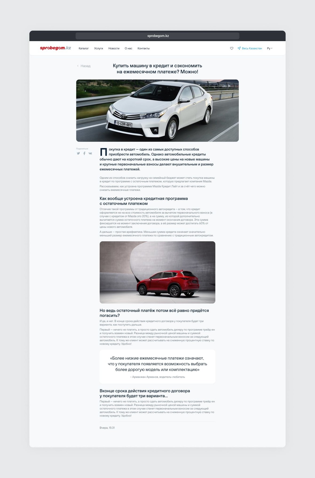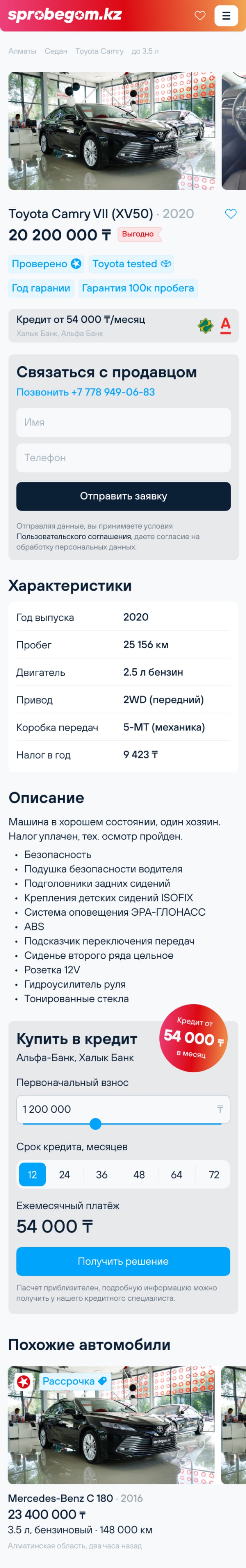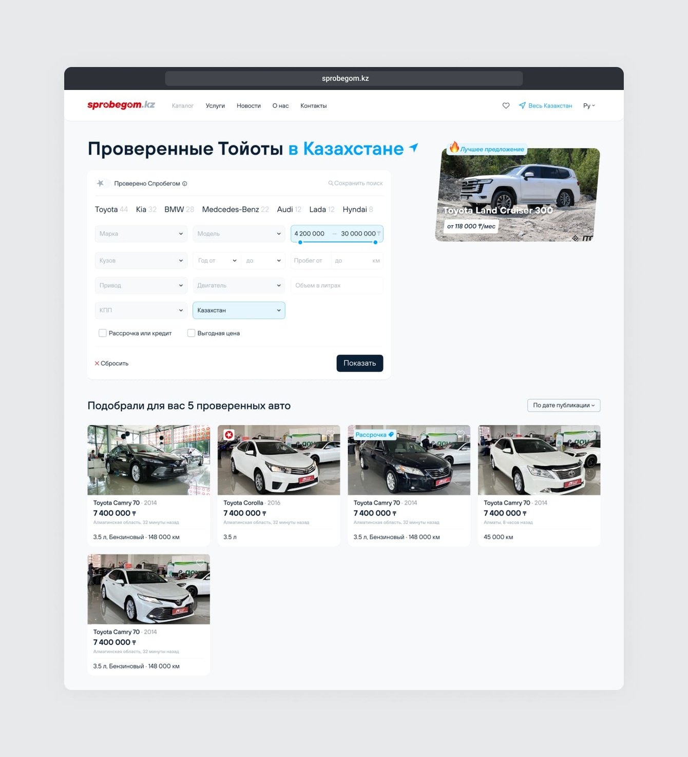 Sprobegom.kz — сервис продажи проверенных подержанных автомобилей из салона. В «Ракетной фирме» спроектировали основные пути пользователя, создали прототипы, оформили дизайн и полностью запрограммировали сервис.