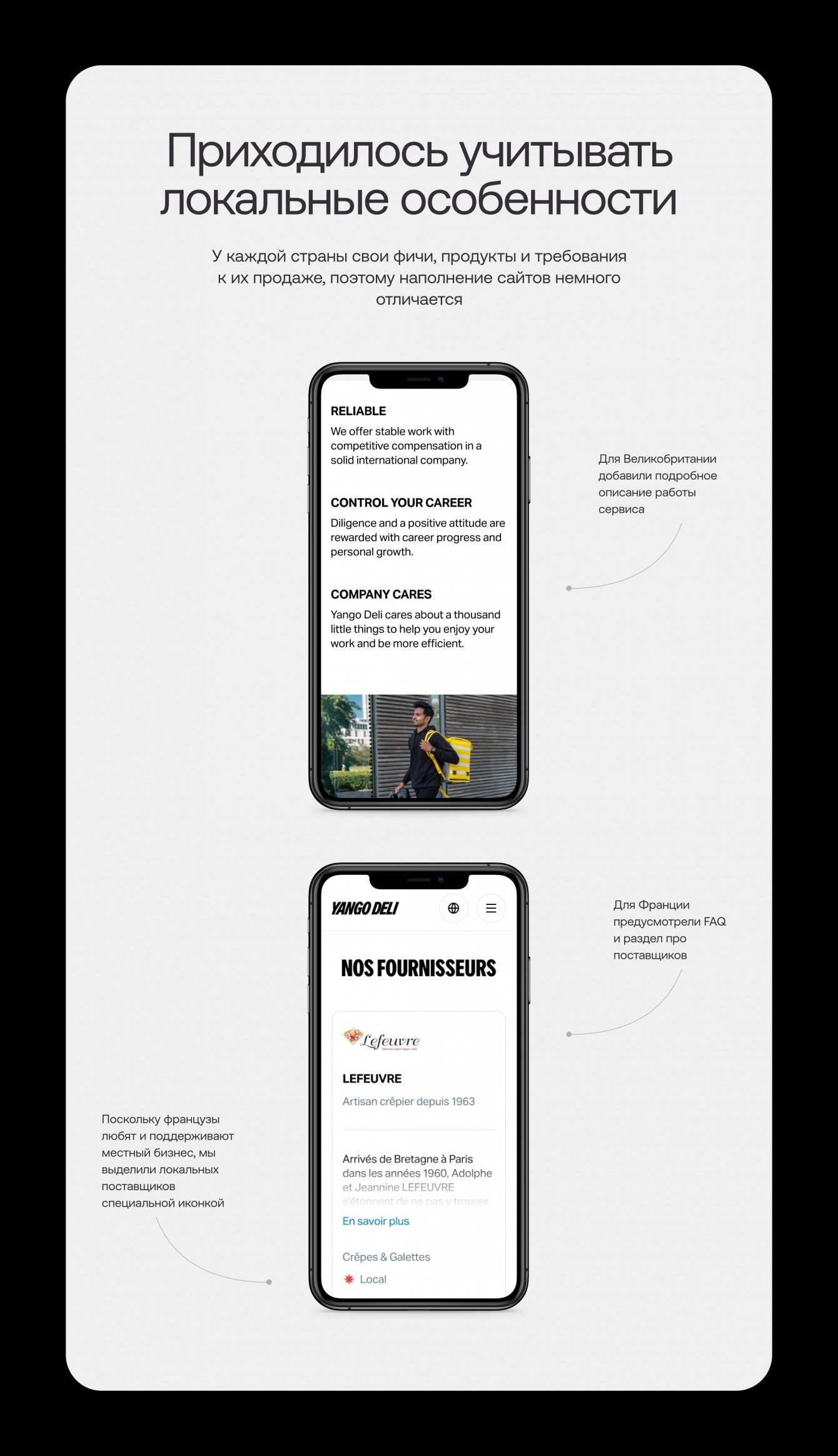 • Приходилось учитывать локальные особенности. У каждой страны свои фичи, продукты и требования к их продаже, поэтому наполнение сайтов немного отличается.