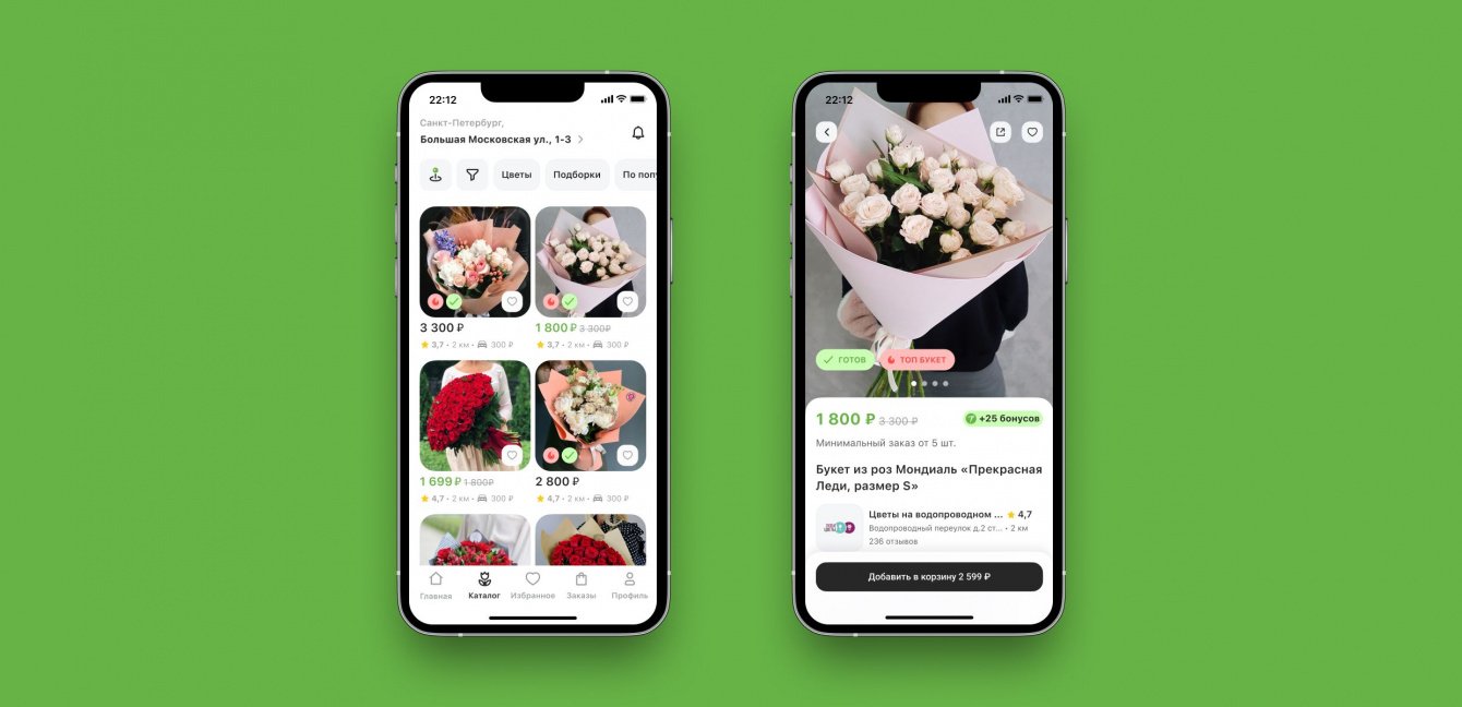 Мы старались смотреть шире просто цветочных приложений и заимствовать лучшие практики из разных сервисов. Мы изучили, как работают сервисы доставки и в России, и в мире. Из российских проанализировали сервисы Яндекса, Dodo Pizza, Ozon и еще около десятка прямых и косвенных конкурентов. Из европейских — Glovo, Wolt и Instacart. Если говорить о масштабе, то смотрели и на гигантов рынка, и на довольно нишевые решения. В совокупности это помогло глубже погрузиться в сферу и понять, что и как мы будем делать в своём продукте.