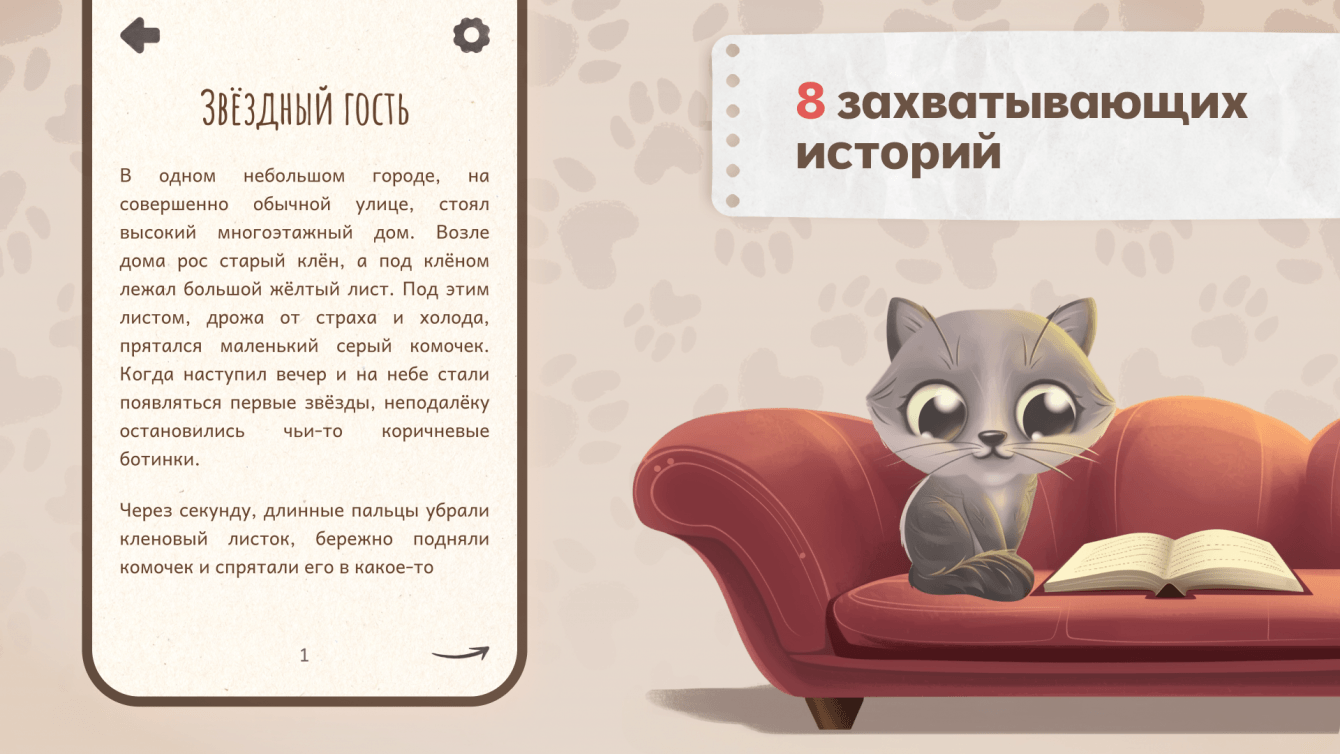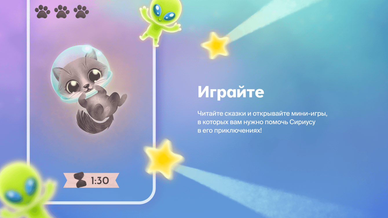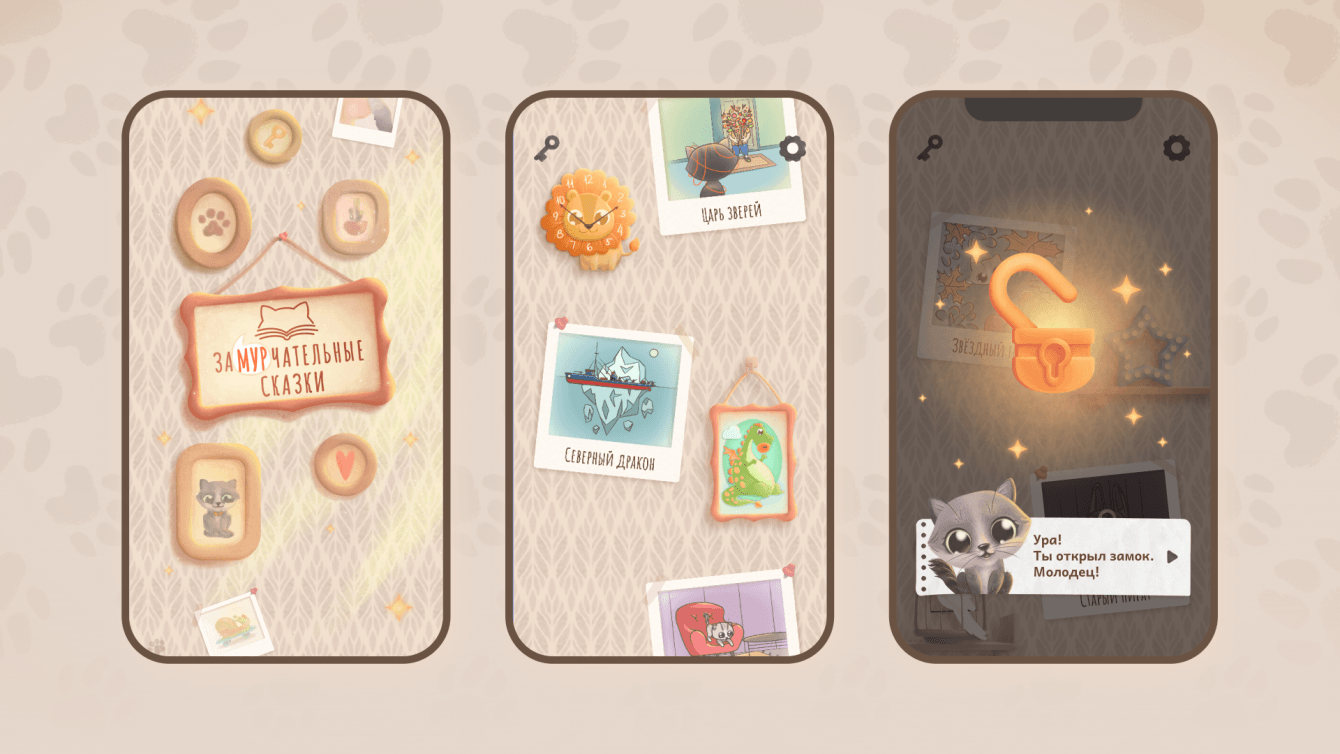 Для вовлечения маленьких покорителей digital мира, мы внедрили механику постепенного открытия контента. Сказки чередовались с простыми мини-играми, где нужно тапать на предметы, летящие на кота Сириуса. Такой подход не только удерживает внимание, но и развивает мелкую моторику, внимательность и ловкость у детей. Кроме того, мы ввели три уровня сложности — каждый подходит для разных возрастных категорий. Это сделало игру интересной как для самых маленьких, так и для детей постарше.