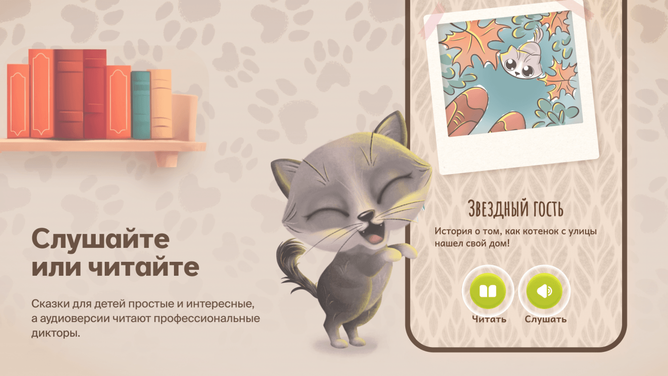 - Два режима взаимодействия: сказку можно либо читать, либо прослушивать — это дает возможность выбрать, как лучше провести время с ребенком;