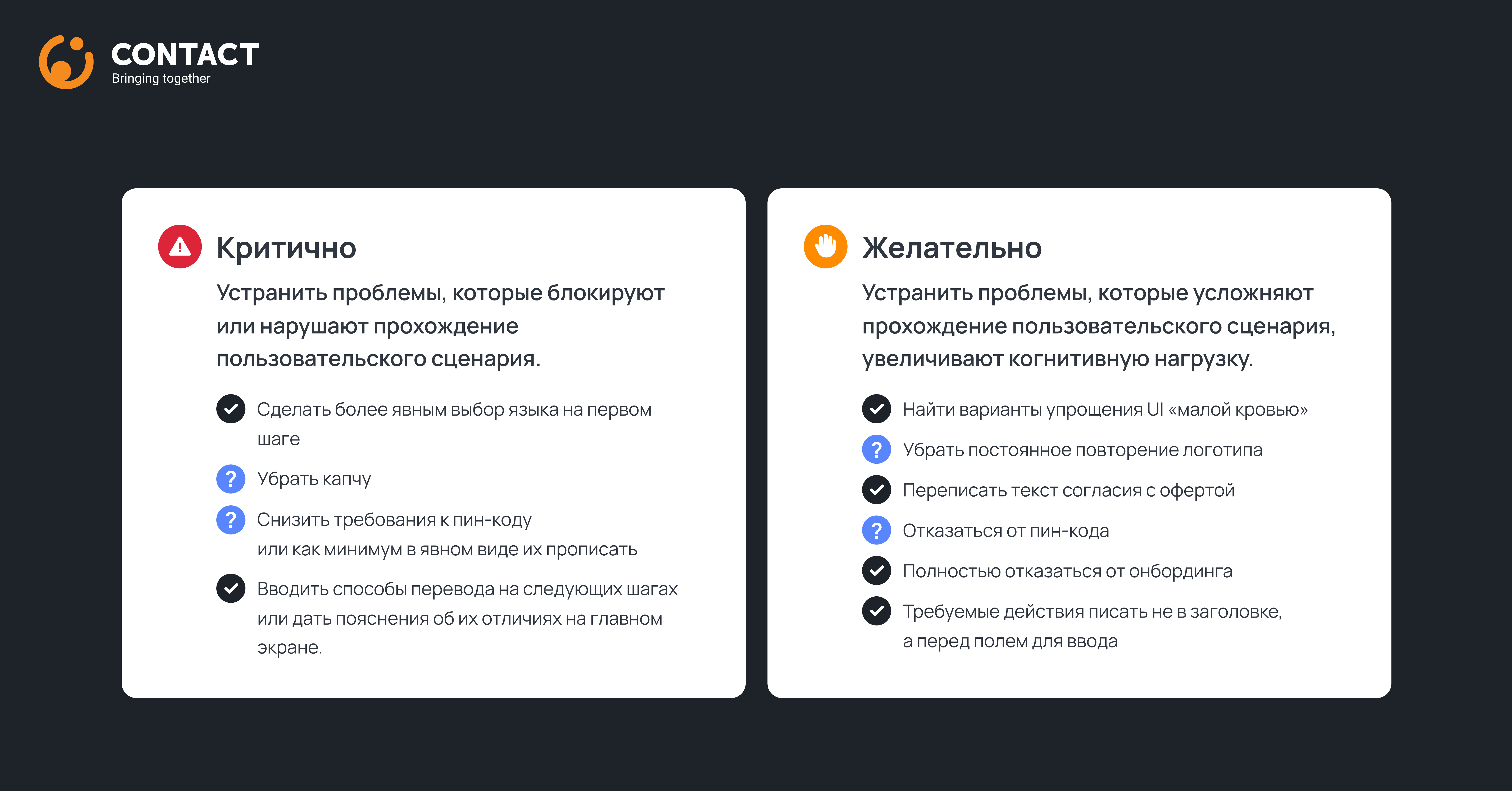 Во-вторых, мы, как и собирались, приоритизировали проблемы, найденные в рамках экспертного аудита. Взяли топ-3 в проработку. Прорабатываем их как с точки зрения интерфейса, так и с точки зрения внутренней кухни, которая за фасадом (это самая сложная часть).