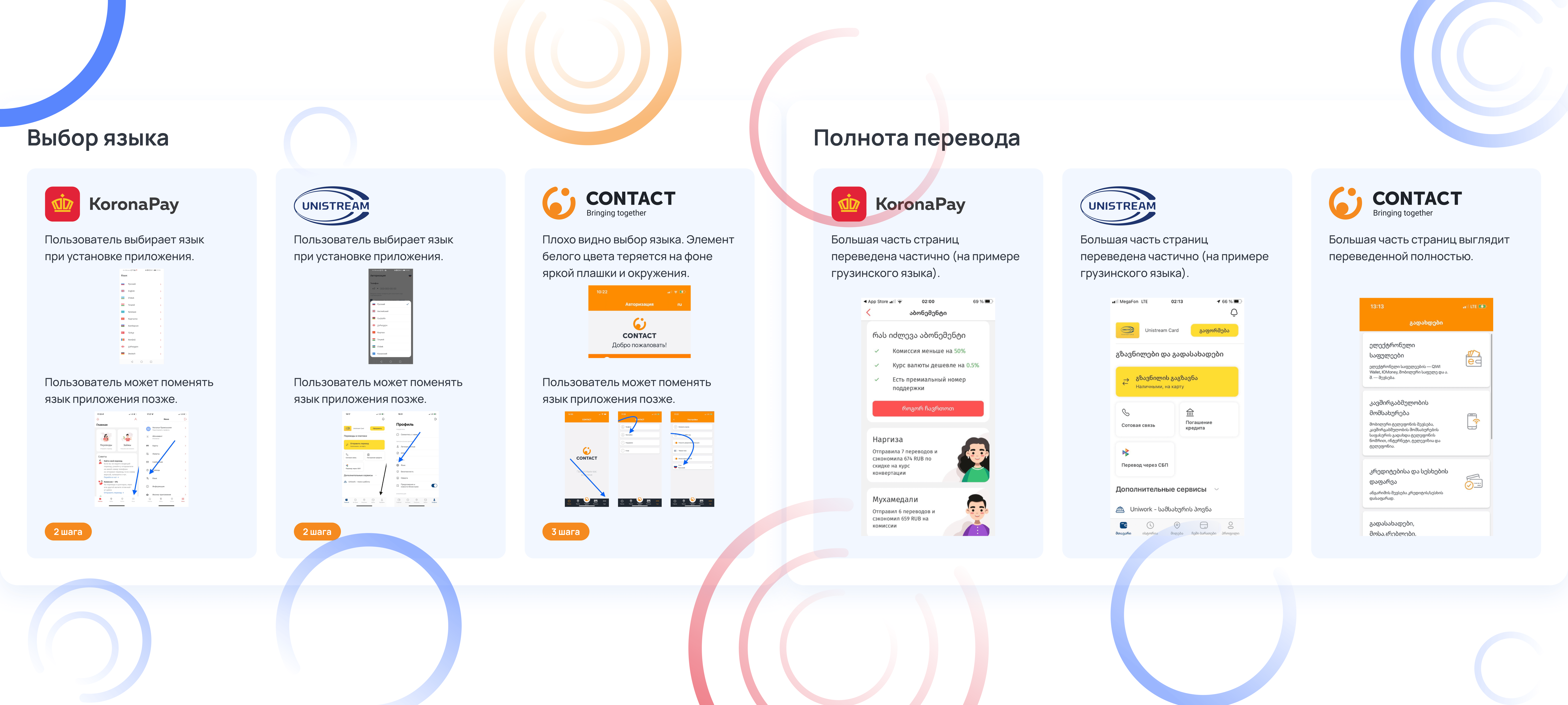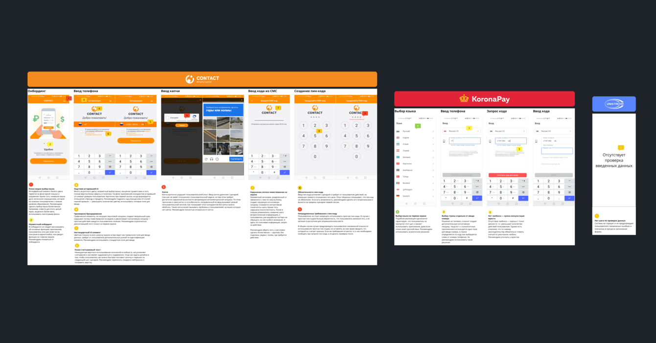 У всех трех систем денежных переводов — похожий набор и последовательность шагов для пользователя. В финальном отчете мы представили пошаговое сравнение с выводами и рекомендациями по каждому шагу.