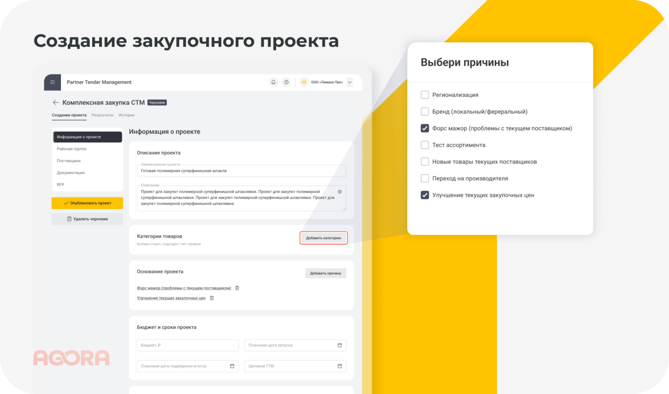 • Основной фокус платформы: проект на закупку является ключевой единицей; проекты можно сохранять как черновики для доработки или публиковать в план графике с доступом для поставщиков.