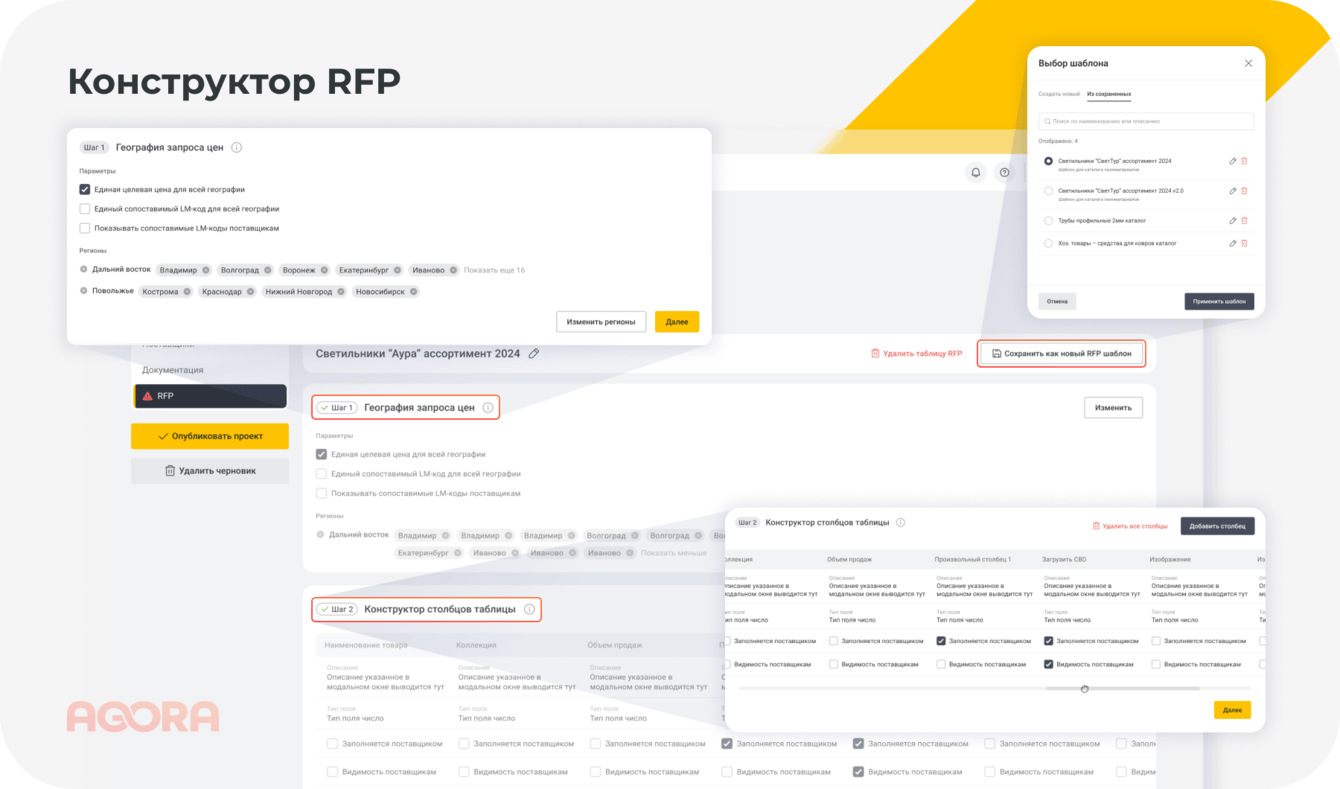 • Гибкий конструктор RFP таблицы: владелец тендера может задавать структуру столбцов, добавлять кастомные поля и правила заполнения, а также определить географию цен (единые или региональные); таблица экспортируется в Excel, заполняется данными и возвращается в систему для проверки и формирования версии для поставщиков; затем назначаются сроки подачи предложений и запускается тендер.