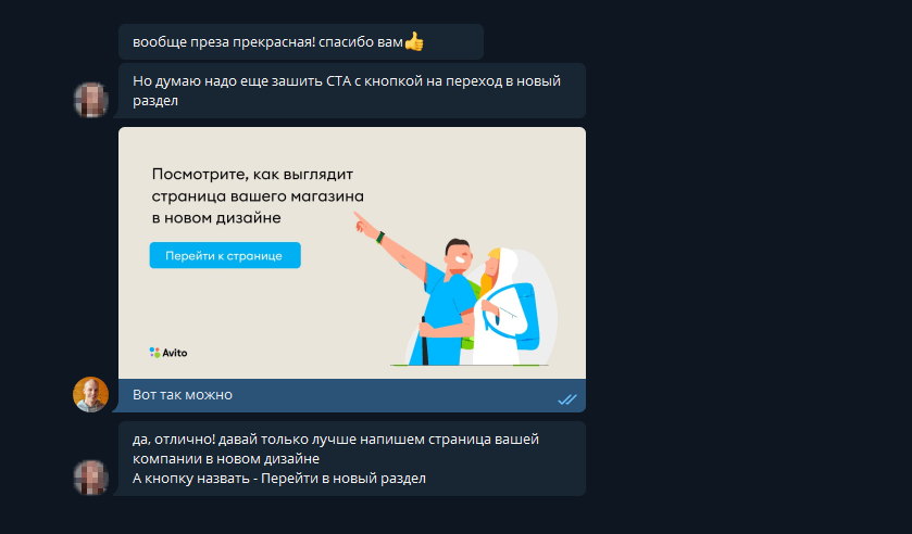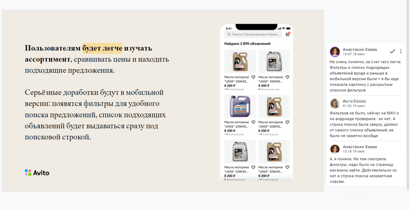 Мы получили обратную связь от главного редактора Авито и быстро внесли изменения в презентацию. Доработки были незначительные, поэтому уложились в срок.