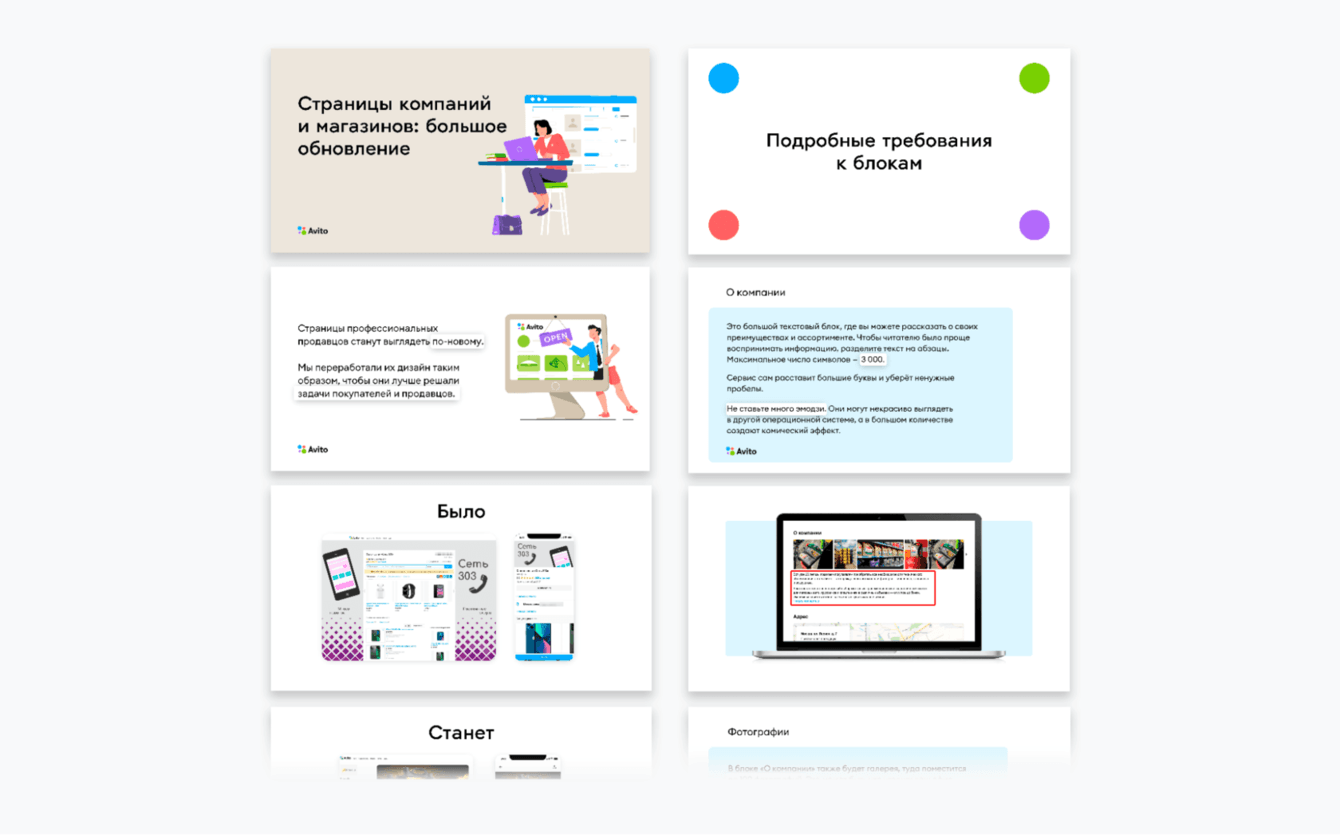 Мы подготовили презентацию с анонсом обновления в двух форматах: pdf и pptx. Всего получилось 35 слайдов, каждый выполнен в фирменном стиле Авито. Обычно такая работа занимает минимум пять рабочих дней, но мы уложились в два выходных, плюс пара часов в понедельник ушла на внесение доработок, которые прислал главный редактор Авито.