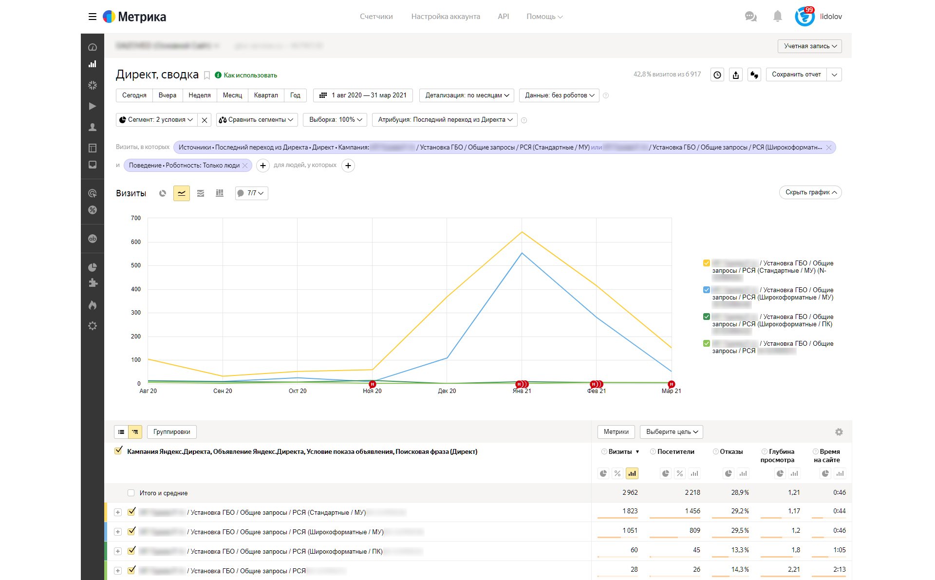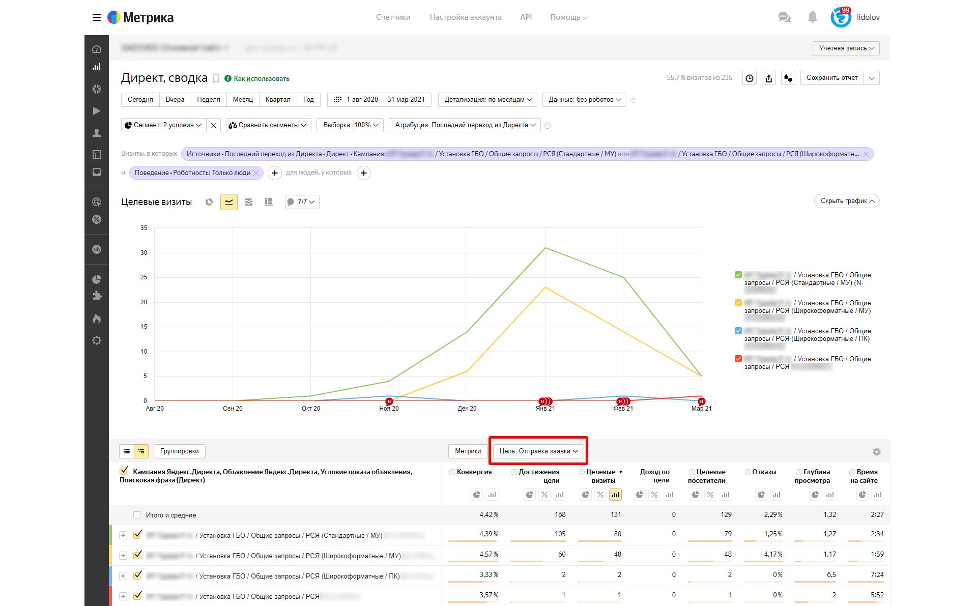 Итог: с сентября по октябрь 2020 года конверсий немного. С ноября 2020 по февраль 2021 года их стало больше, стоимость колебалась в диапазоне 300-400 рублей.