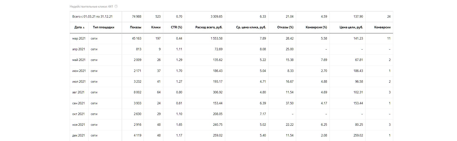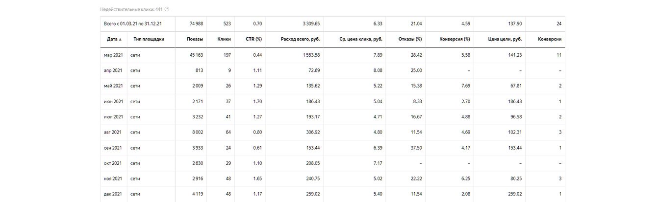 С марта 2021 года показатели начали ухудшаться. Но дело было не только в самом бюджете. На микробюджете системе легко не хватить данных для обучения, если трафик дополнительно дробится настройками: отдельные кампании по устройствам, ограничения по форматам, ручные корректировки. В такой конфигурации алгоритму просто не хватало объема для стабильной оптимизации. В апреле РСЯ фактически перестала давать результат.