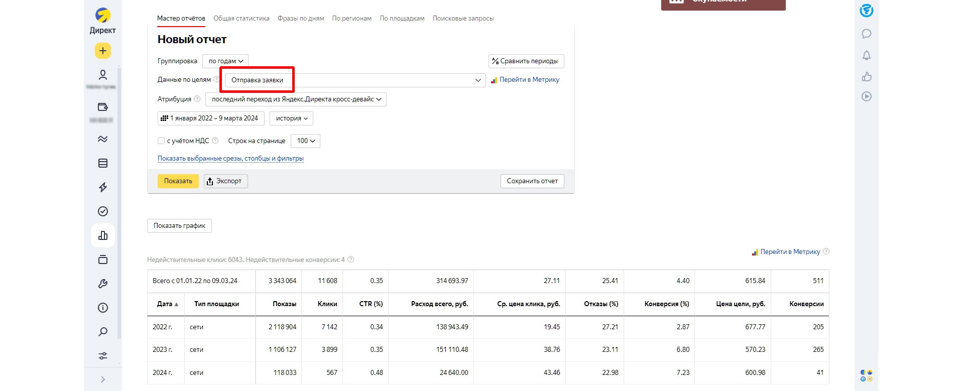 Итог: стоимость достижения цели "Отправка формы" по поиску колебалась от 1500 до 2500 рублей. Для этого бюджета — дорого.