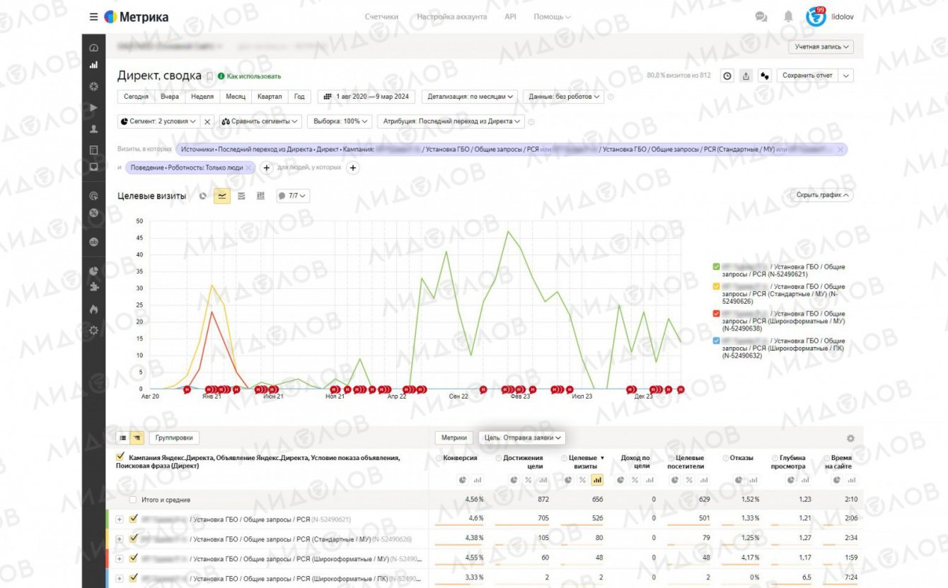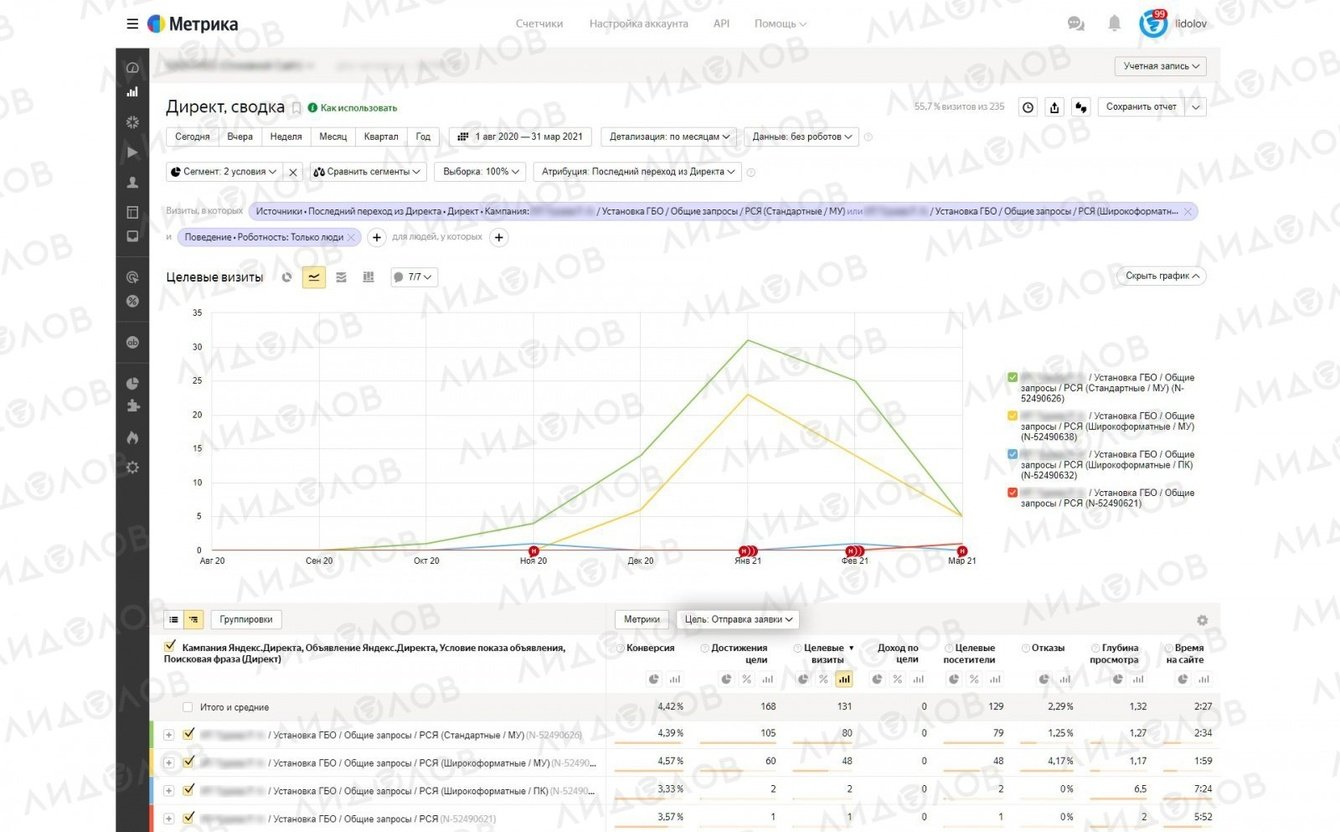 РК стабильно работает по модели CPA и приносит заявки на установку ГБО. Средняя цена цели «Отправка формы» 615 рублей.