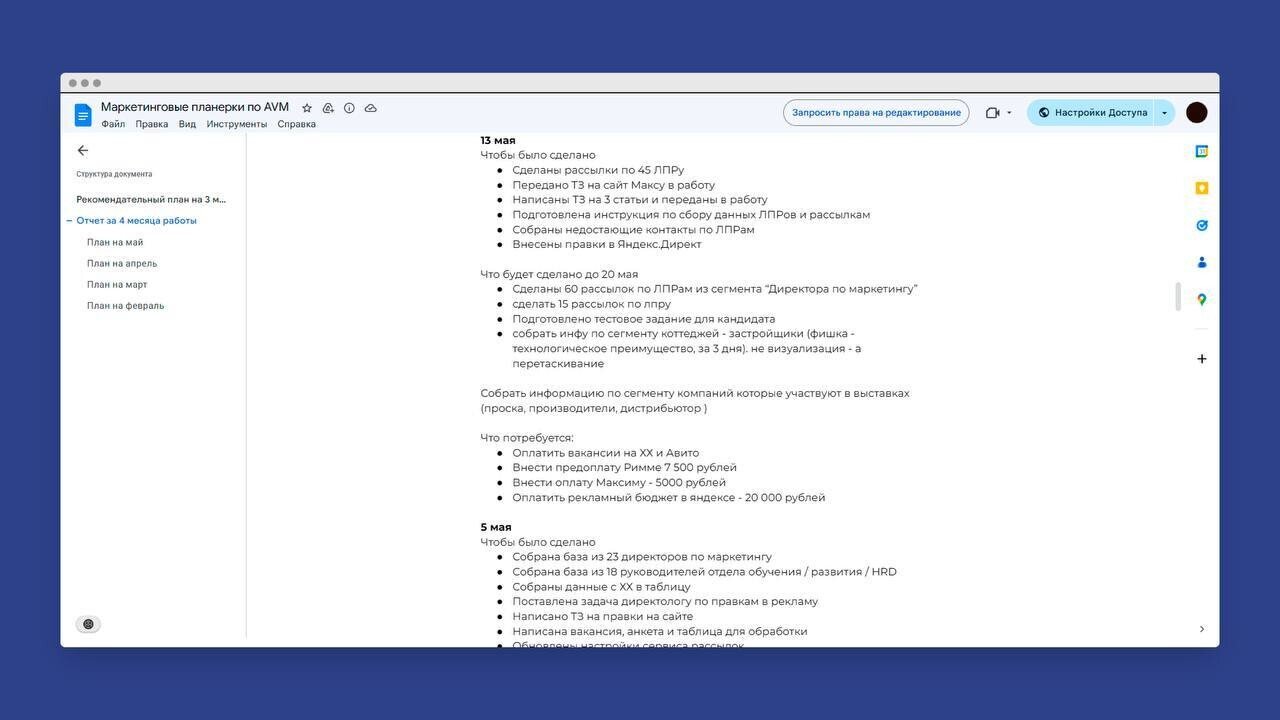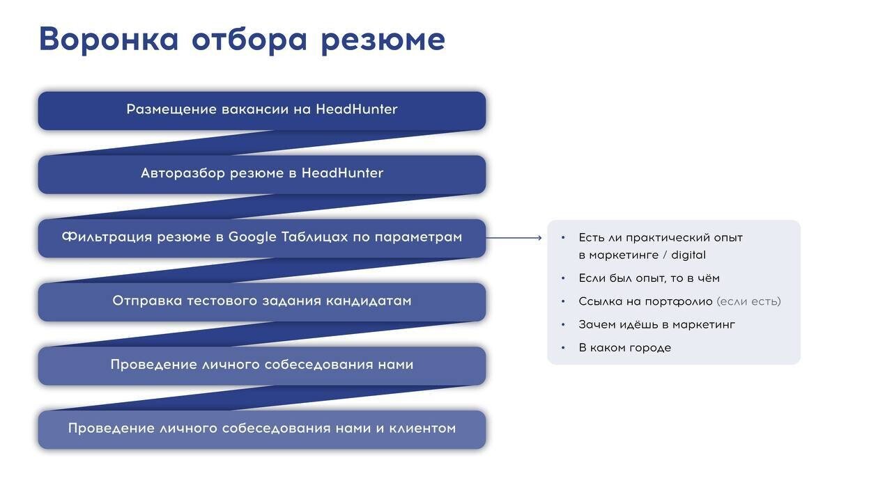 Правда, когда я уже выбрал специалиста, оказалось, что в вакансии на HeadHunter, которую публиковал клиент, не был указан город. В итоге пришлось выбрать другого начинающего маркетолога, для которого я составил подробный план работы на месяцы вперёд и передал ему все дела.