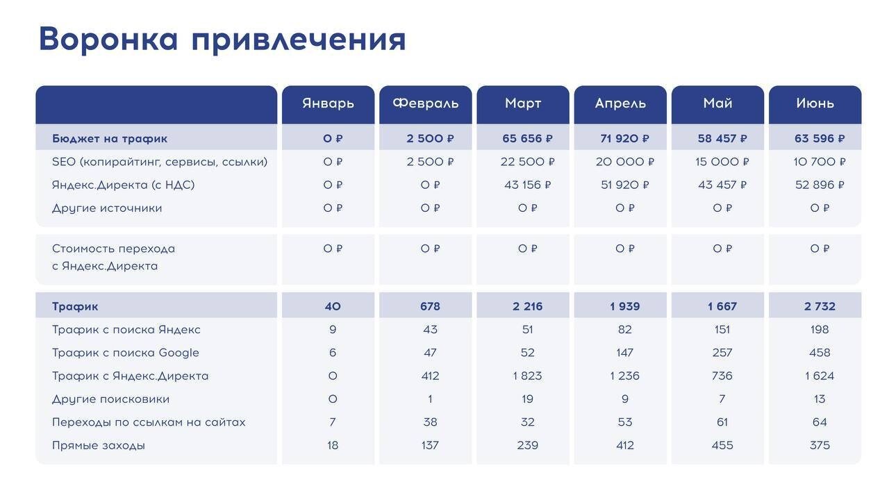 Когда компания связалась с нами, мы провели аудит и разработали коммерческое предложение, в котором прописали цели сотрудничества, план их достижения со сроками и смету. При этом мы гарантировали достижение KPI — если бы не удалось за три месяца наладить поток лидов и сделать его стабильным, мы бы вернули 50% от суммы услуг.
