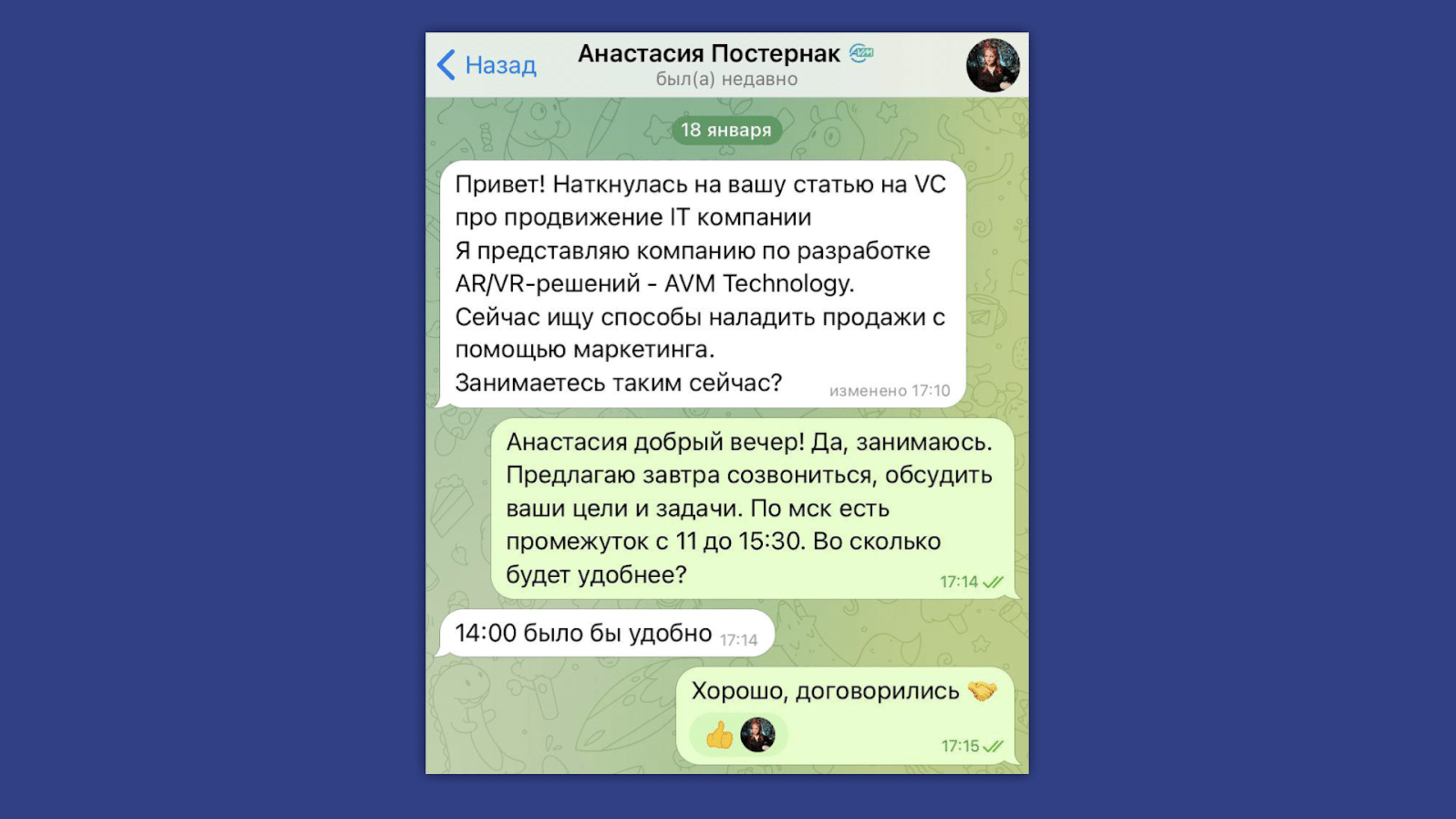 Параллельно с этим собрали по открытым источникам контакты ЛПРов в Telegram и писали им, под каждого продумав индивидуальный скрипт.