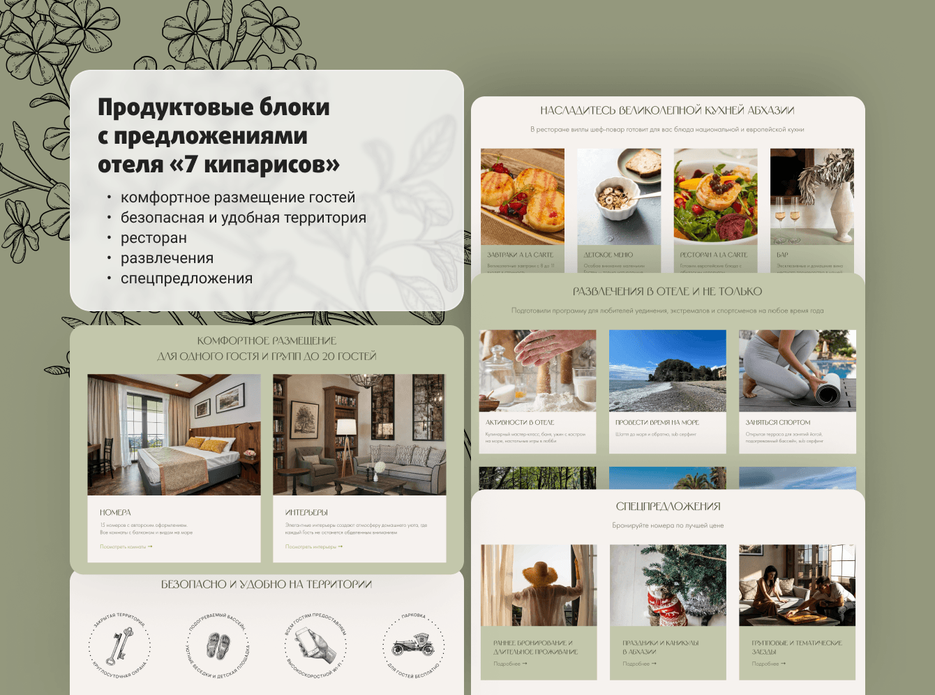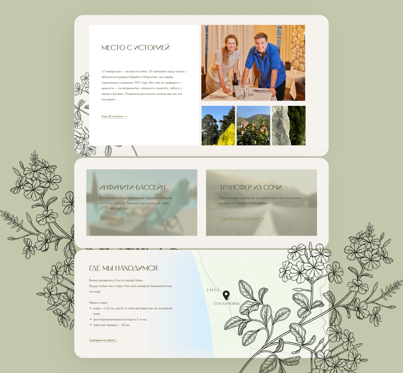 1. Фиксирует внимание пользователей на всесезонном отдыхе без привязки к морю. Акцент сделан на зеленые оттенки, которые напоминают о кипарисах и природе Абхазии вообще. Бежевый цвет — это уют и отсылка к интерьерам бутик-отеля.