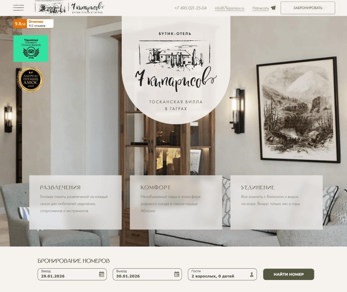 Телефон, адрес электронной почты и кнопку «Забронировать» легко найти — они находятся в шапке сайта.