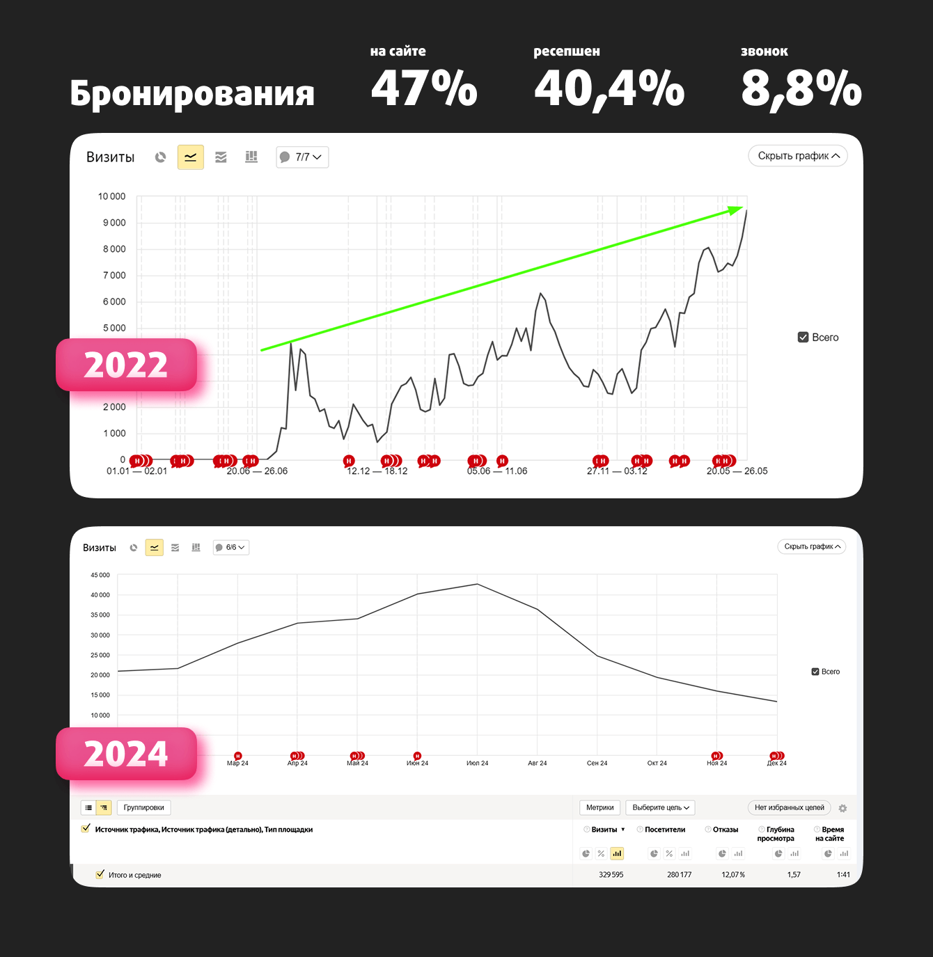 Благодаря высокому трафику около 47% бронирований происходит на сайте. Причем средний чек таких бронирований на 33% больше, чем у покупок на ресепшен, агрегаторах или по звонку (это данные за два первых года работы отеля).