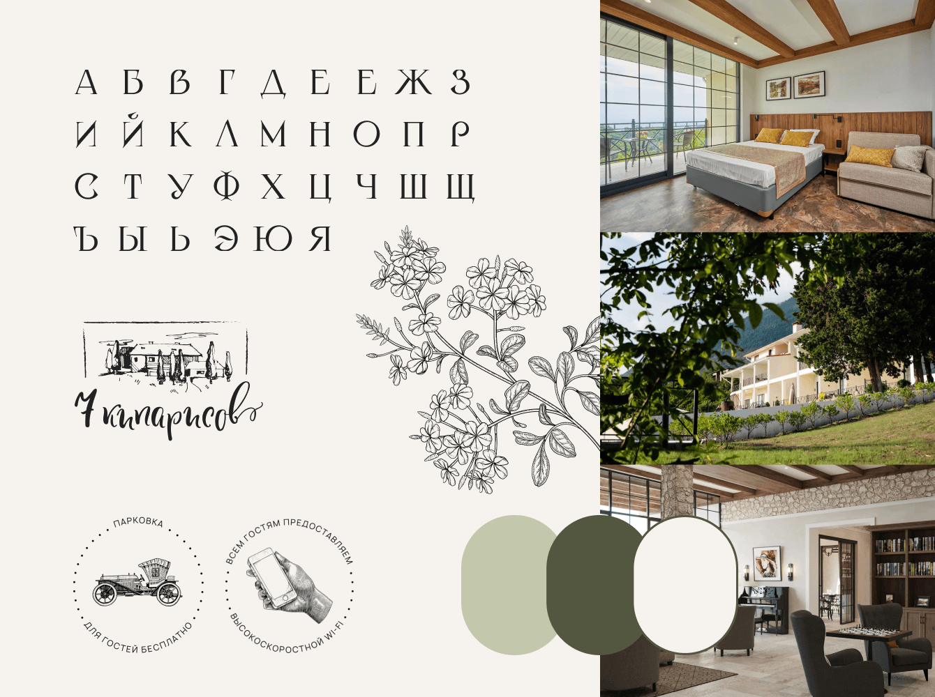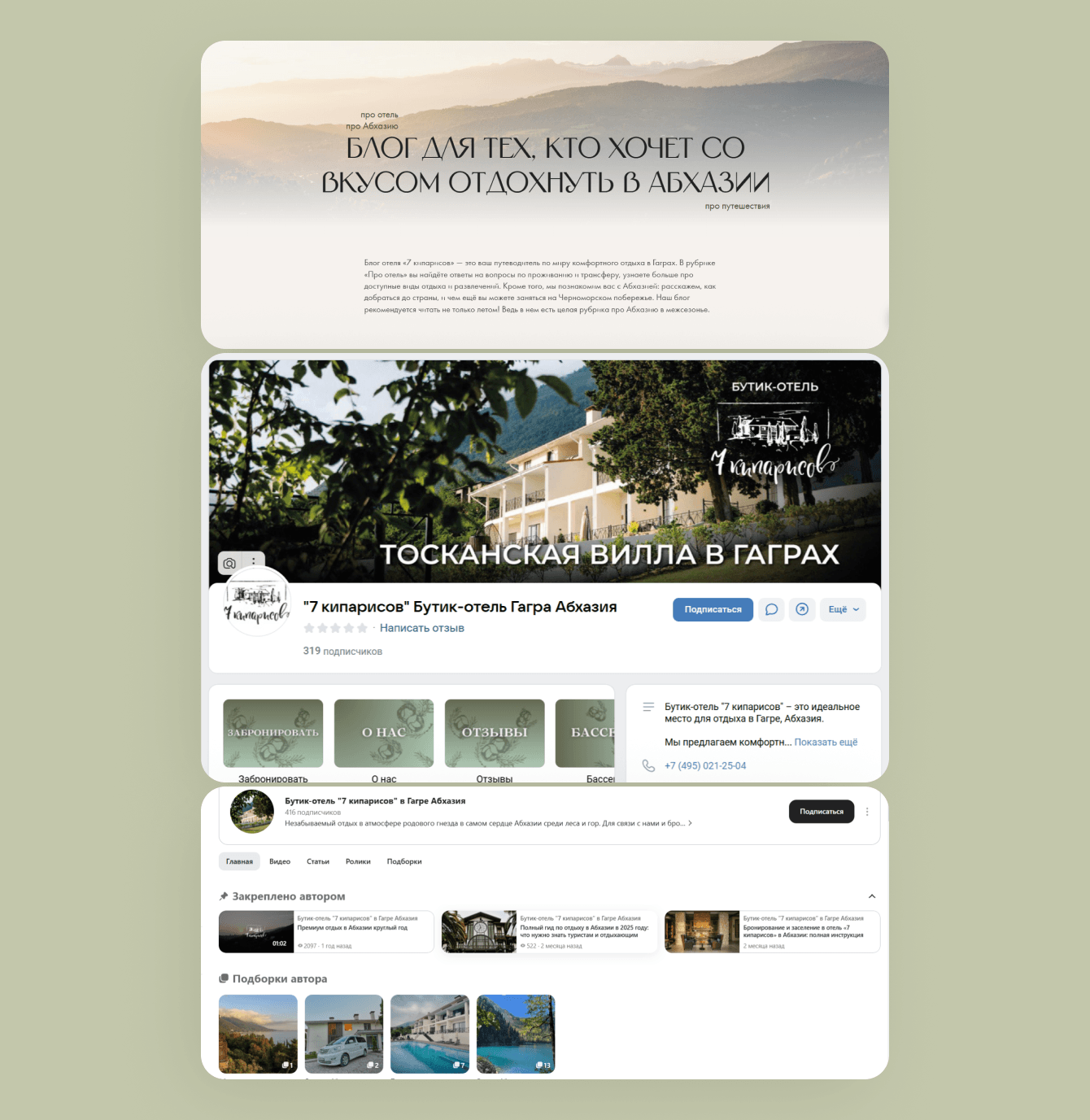 1. Фиксирует внимание пользователей на всесезонном отдыхе без привязки к морю. Акцент сделан на зеленые оттенки, которые напоминают о кипарисах и природе Абхазии вообще. Бежевый цвет — это уют и отсылка к интерьерам бутик-отеля.