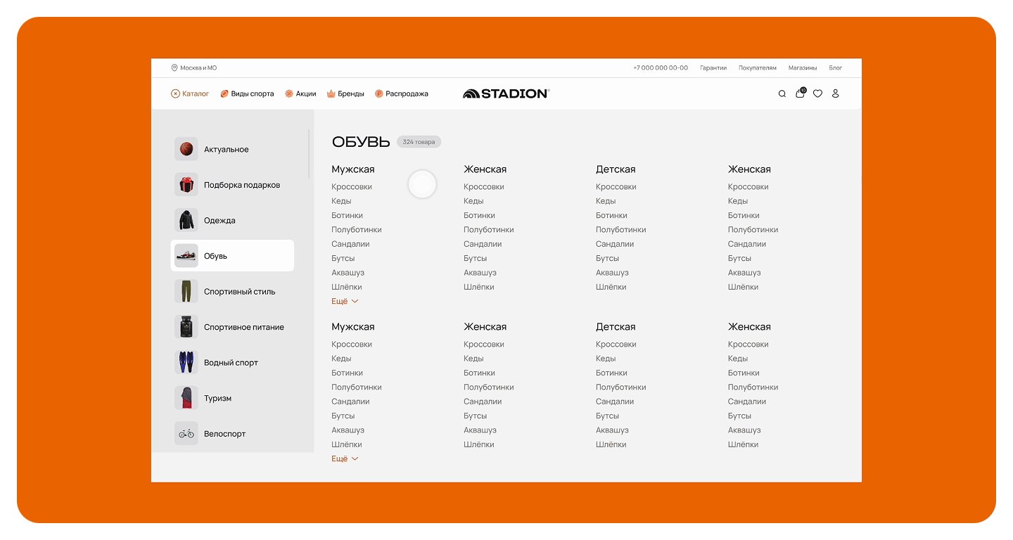 К нам пришел владелец офлайн-точки Стадион ПРО с запросом на создание крупного федерального интернет-магазина. Стадион ПРО — магазин спортивной экипировки для фитнеса, бега, туризма и других активностей. Ранее он работал только офлайн и через соцсети, успешно развивая бизнес и формируя лояльную клиентскую базу. Теперь компания готова была выйти на новые рынки, чтобы предложить товар еще большей аудитории.