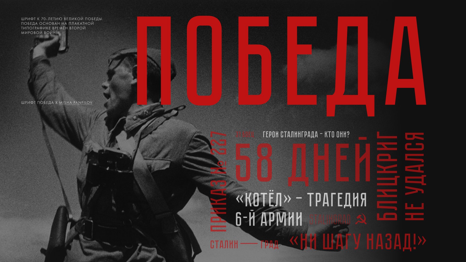 Крупный шрифт, контрасты и узнаваемые символы создают живой диалог с историей. За основу типографики взяли плакатную эстетику военных лет, шрифт создал графический дизайнер Миша Панфилов.