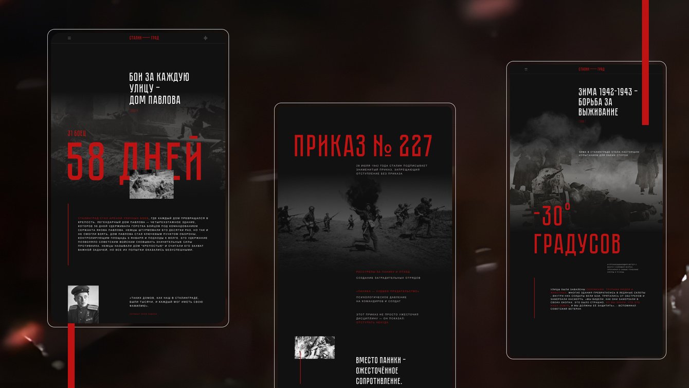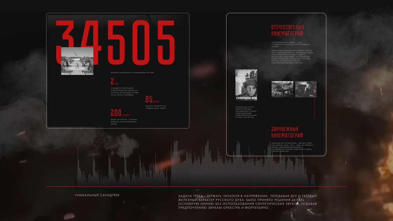 Для последней главы — «Сталинградское сражение в искусстве» — мы вручную скриншотили кадры из фильмов, чтобы добиться нужного визуального эффекта. Изображения из интернета не годились: низкое качество, чужая интерпретация — любая мелочь могла исказить наш замысел.