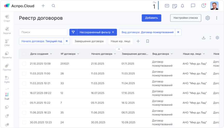 Мы внедрили платформу для управления проектами и бизнес-процессами Аспро.Cloud. Благодаря сотрудничеству платформы для НКО «Технологии Добра» и Аспро.Cloud команда «Мир да Лад» получила скидку 50% на тариф и смогла самостоятельно, при поддержке техподдержки, перенести все процессы в новую систему.