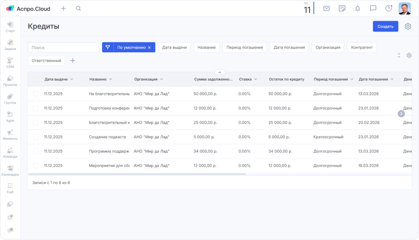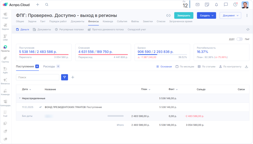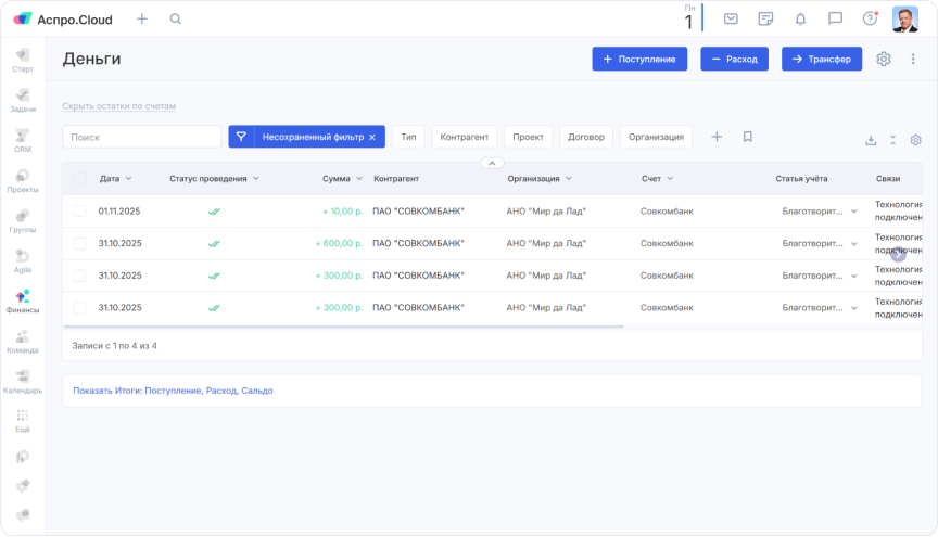 Чтобы уйти от ручного сбора финансовой информации, команда подключила интеграцию Аспро.Cloud с банками Точка и Сбербанк в модуле «Деньги». Все платежи теперь автоматически загружаются в систему. Руководитель привязывает каждый платеж к конкретному проекту, и в карточке проекта мгновенно отображаются плановые и фактические доходы/расходы. Также в модуле «Кредиты» фиксируются беспроцентные займы от учредителей, что помогает вовремя их возвращать и поддерживать финансовую дисциплину.