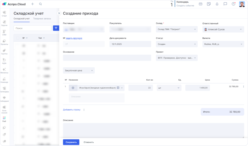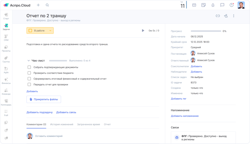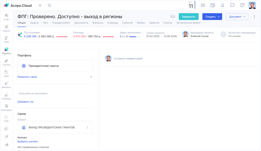 Первым шагом команда перенесла управление проектами в Аспро.Cloud. Для каждого нового проекта (например, адаптация игры или подготовка конференции) создается отдельная карточка. В ней теперь фиксируется всё: план работ, список задач и ответственных, дедлайны, а также связанные документы и финансы. Это избавило руководителя от необходимости держать детали в голове и ликвидировало информационную неопределенность среди сотрудников.