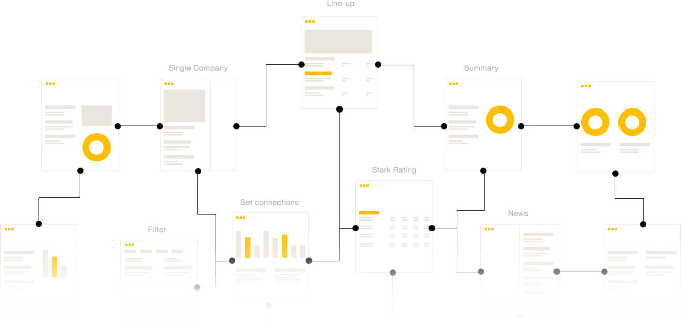 Большое внимание уделялось проектированию интерфейса. У проекта сложная навигация и много взаимосвязанных страниц. Мы детально проработали карту экранов и минимизировали путь пользователя.