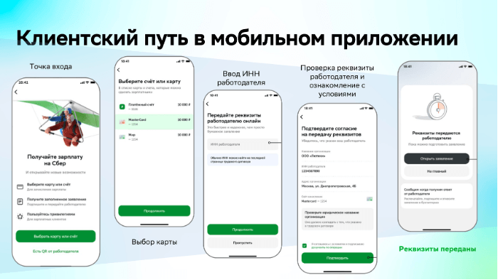 Чтобы реализовать первый этап работы, необходимо было создать сценарий, в котором сотрудник мог удобно и быстро найти своего работодателя и отправить реквизиты в корректный личный кабинет бухгалтера в Сбербизнес, чтобы как можно быстрее и проще начать получать зарплатные выплаты и пользоваться привилегиями сбера.
